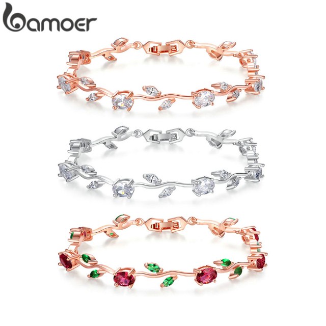 Bamoer Pulseira Com Folha De Rosa Cor De Ouro & Elo Vermelho + Verde AAA Zircon Para Presente/Mãe Jóias JIB072