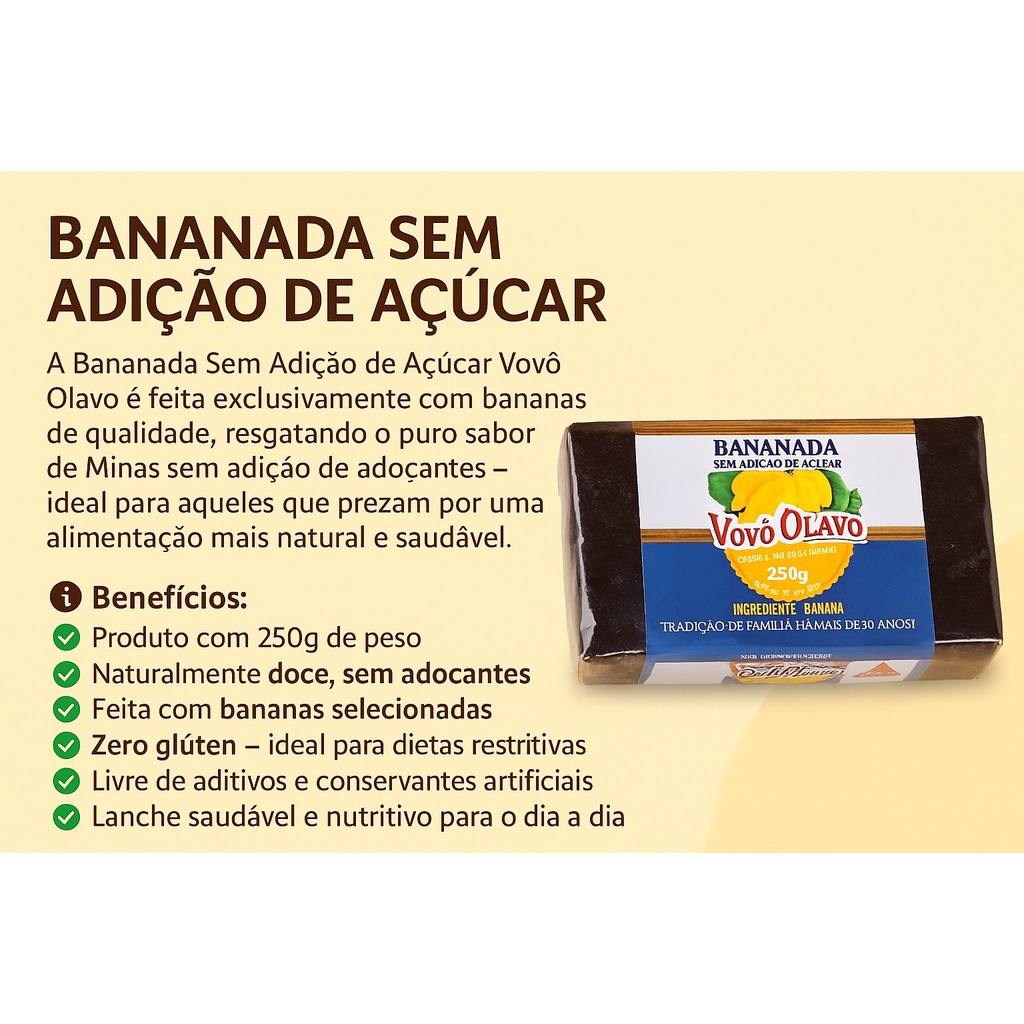 A Bananada Sem Açúcar Vovô Olavo 250g é feita com banana madura selecionada e sem adição de açúcar, mantendo o sabor autêntico e adocicado da fruta. Produzida em Ponte Nova – MG, segue a tradição de mais de 50 anos da família, com textura macia e sabor natural, ideal para quem busca uma opção saudável e energética. ℹ️ Benefícios: ✅ 100% banana – sem adição de açúcar ✅ Textura macia e sabor naturalmente doce ✅ Sem glúten – ideal para dietas restritivas ✅ Fonte de energia e fibras naturais ℹ️ Ficha Técnica: ✅ Produto: Bananada em Barra Sem Açúcar ✅ Marca: Vovô Olavo ✅ Peso: 250g ✅ Ingrediente: Banana ✅ Glúten: Não contém ✅ Açúcares adicionados: Não contém ✅ Conservantes: Não contém ✅ Embalagem: Barra plástica ✅ Origem: Ponte Nova – Minas Gerais