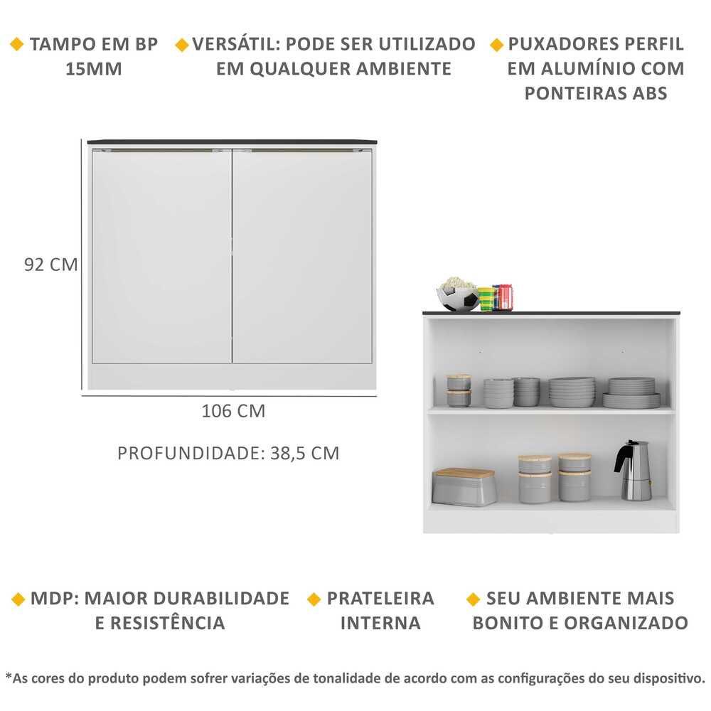 A Bancada Multimóveis foi pensada para quem possui pouco espaço e precisa otimizar seu ambiente. Produzida em MDP com acabamento acetinado (cerca de 20% de brilho), que garante maior durabilidade e resistência, possui duas portas com prateleira interna e um amplo espaço para organizar utensílios e mantimentos. Além de poder utilizar este móvel como bancada, é possível usá-lo também como divisor de ambientes, já que a mesa de apoio pode ser montada como prateleira decorativa. O tampo em BP preto 15mm e os puxadores perfil em alumínio com ponteiras ABS traduzem a modernidade e elegância do design moderno. Conteúdo da Embalagem: 1 (um) Balcão/bancada Kit ferragem Manual de montagem Dimensões do produto montado: Altura: 92cm | Largura: 106cm | Profundidade: 67,5cm *Você pode consultar as medidas detalhadas na imagem técnica do produto. *As cores do produto podem sofrer variações de tonalidade de acordo com as configurações do seu dispositivo. Imagem meramente ilustrativa. Decoração não acompanha o produto. O produto será entregue desmontado e não disponibilizamos o serviço de montagem.
