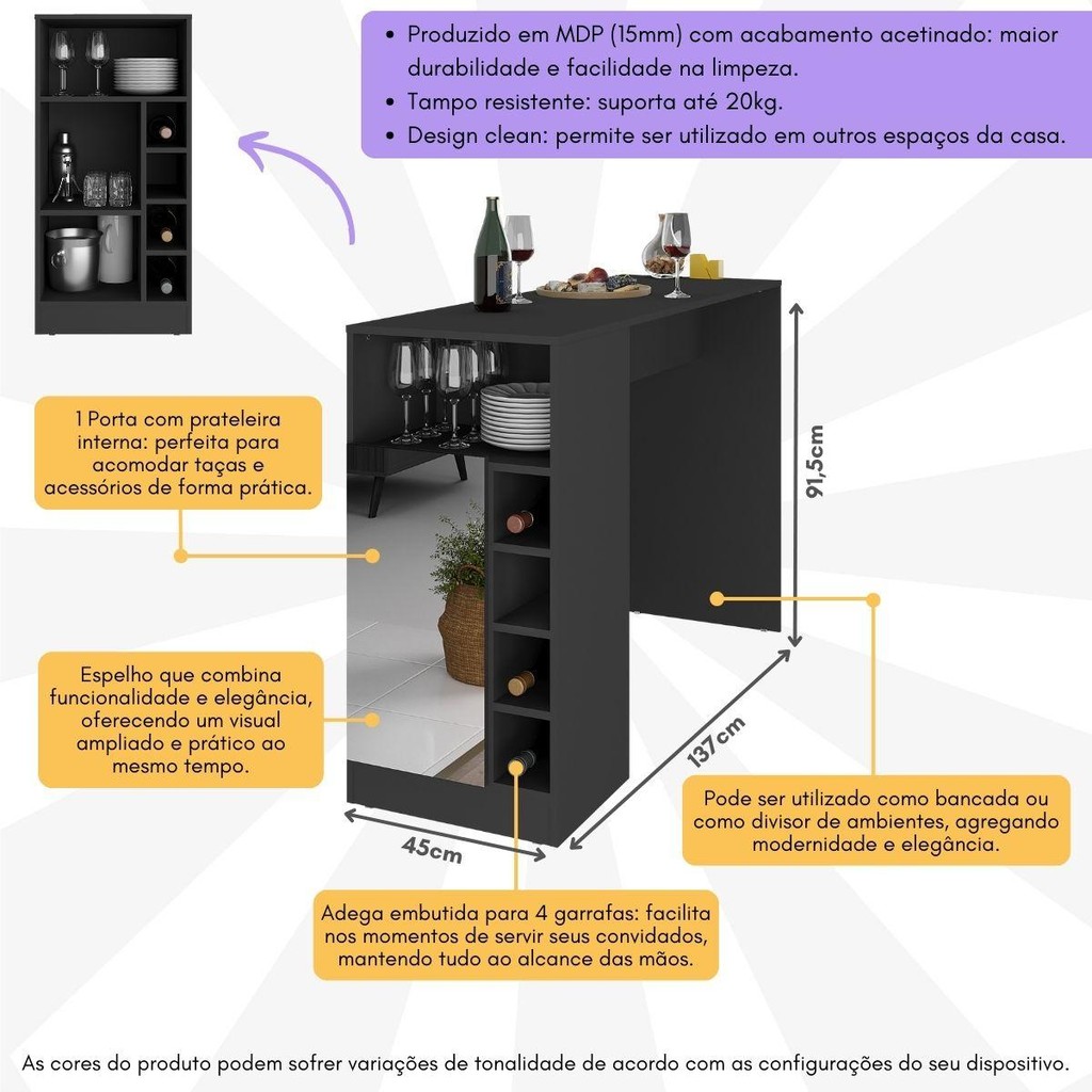 A Bancada Balcão/Mesa de Cozinha com Adega e Espelho Multimóveis MP2248 é ideal para quem quer unir organização, estilo e praticidade em um único móvel. Moderna e versátil, ela transforma o ambiente e deixa tudo mais funcional, seja na cozinha, sala de jantar ou em espaços integrados. Além de funcionar como bancada ou mesa de apoio, ela também pode ser usada como divisor de ambientes, trazendo um visual sofisticado e atual. O tampo é resistente e perfeito para apoiar bebidas, louças ou servir petiscos em momentos especiais. Na lateral, a porta com prateleiras ajuda a manter taças e utensílios organizados, enquanto a adega embutida deixa seus rótulos favoritos sempre à vista. O espelho acrescenta elegância ao móvel e ainda ajuda a ampliar visualmente o espaço. ✨ Por que escolher esta bancada? ✔ Funciona como bancada, mesa ou divisor de ambientes ✔ Adega embutida para organizar vinhos com charme ✔ Espelho que valoriza o ambiente e amplia o espaço ✔ Espaço interno ideal para taças e utensílios ✔ Design moderno com excelente custo-benefício 💡 Dica valiosa dos clientes: posicione a bancada próxima à sala de estar ou área gourmet e use o tampo como apoio para drinks. O espelho ajuda a iluminar o ambiente e cria um efeito visual elegante, ideal para receber visitas. 📦 Conteúdo da embalagem 1 (uma) Bancada com Adega 1 Espelho Kit de ferragens Manual de montagem 📐 Dimensões do produto montado Altura: 91,5 cm Largura: 137 cm Profundidade: 45 cm Confira as medidas detalhadas na imagem técnica do produto. ⚠️ Observações importantes Produto entregue desmontado (não oferecemos serviço de montagem) As cores podem variar conforme a configuração da tela do seu dispositivo. Imagem meramente ilustrativa. Itens de decoração não acompanham o produto. ⚡ Aqui na Loja Multimóveis, você compra com total segurança e recebe sua entrega garantida.