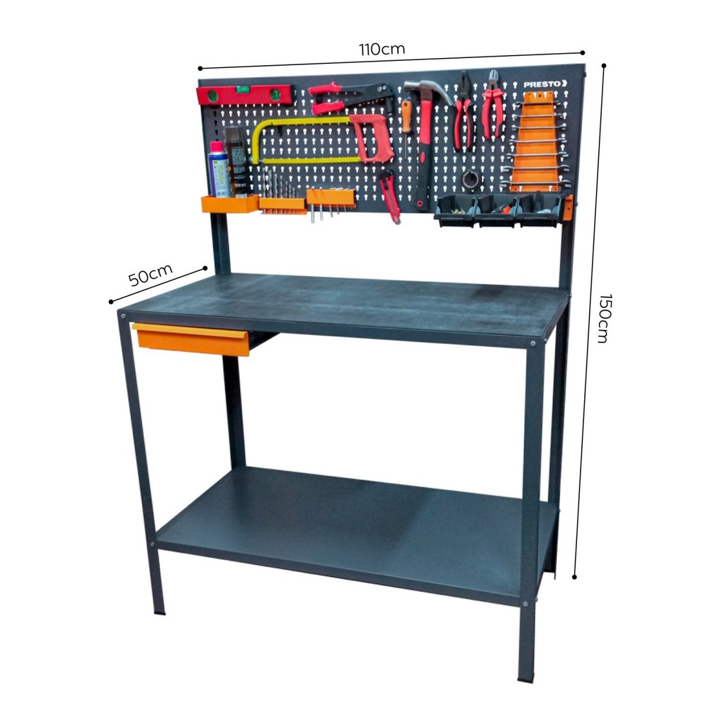 Bancada de Trabalho c/ Acessório, feita em chapa de aço de baixo teor de carbono, c/ tratamento químico fosfatizante e antiferruginoso e pintura eletrostática a pó, o que garante uma proteção eficaz contra corrosão e um acabamento de alta qualidade. Desenvolvida p/ atender às demandas exigentes, seja no ambiente doméstico ou de trabalho, tem capacidade de carga de até 250 kg distribuídos. Por ser compacta, é ideal para espaços reduzidos. É composta por 4 colunas, 4 sapatas plásticas, 2 tampos em aço, 1 painel perfurado, 1 gaveta c/ corrediças telescópicas, 1 kit de ganchos plásticos, 1 kit acessórios de metal e 1 manta de borracha. Ferramentas manuais são ilustrativas, não acompanham o produto. Com 110x150x50cm, esta bancada oferece amplo espaço de trabalho. Peso (kg): 18.288 Dobrável: Não Garantia: 12 Meses Altura (cm): 150 Ergonômico: Não Largura (cm): 110 Possui Pés: Não Desmontável: Sim Possui Tampo: Não Possui Portas: Não Comprimento (cm): 50 Possui Gavetas: Sim Suporta Até (kg): 250 Profundidade (cm): 50 Gaveta com Chave: Não Origem do Produto: Nacional Sapatas Niveladoras: Não Material Principal Ferramentas: Aço Carbono Tipo de Mecanismo da Ferramenta: Não se Aplica Marca: Presto Modelo: 91513 Composição: Aço Itens Inclusos: Acompanha 1 kit misto de ganchos plásticos (24 ganchos) e 1 Kit Misto de Acessórios de Metal , 1 Suporte para gavetas plásticas, 3 gavetas plásticas n.º 3 e 1 manta de borracha. Cor Predominante: Cinza Quantidade de Gavetas: 01 Gaveta
