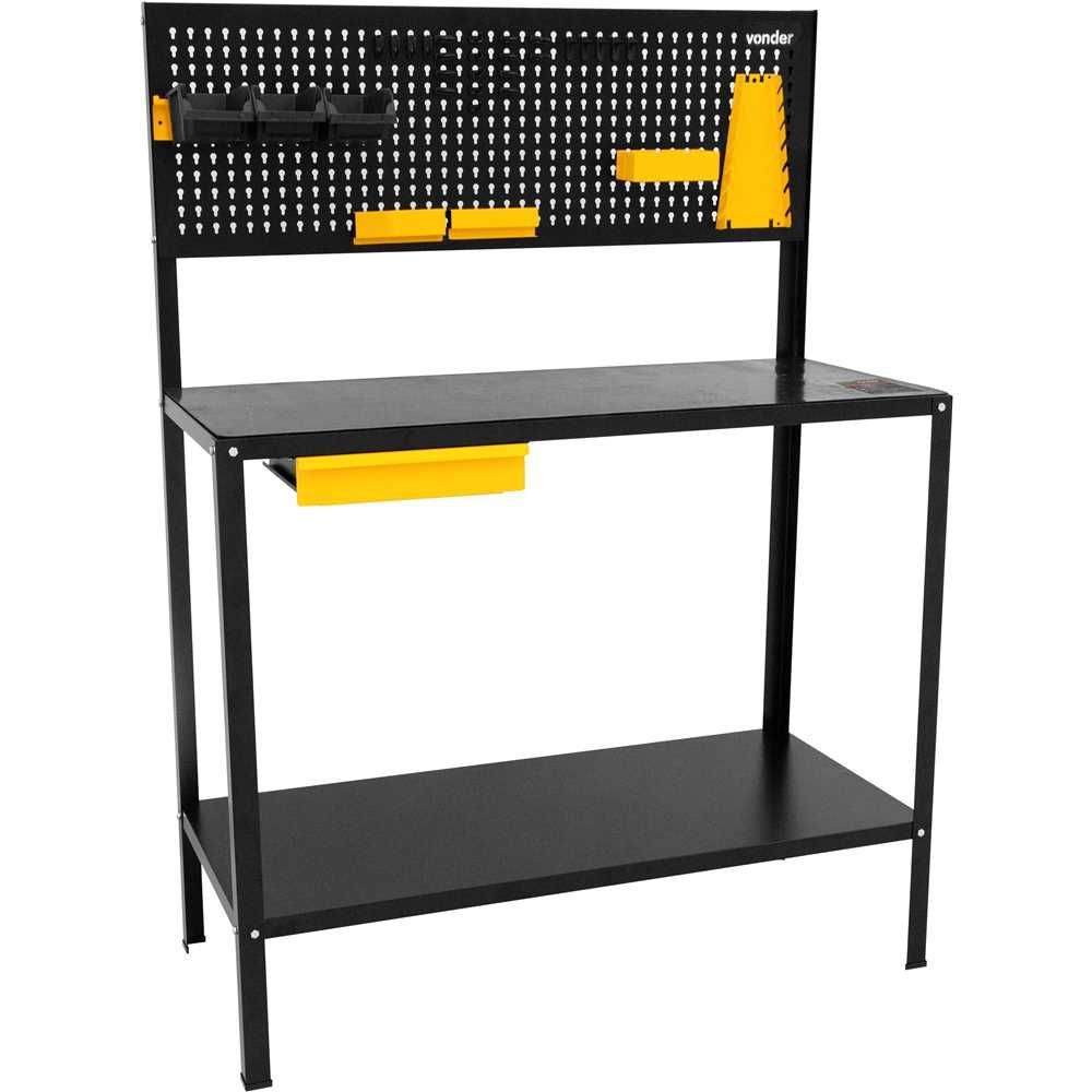 Código Fornecedor: 6140058513 Marca: Vonder Conteúdo da embalagem: 1 Bancada multiuso. Acompanha: 1 suporte para brocas, 1 suporte para chaves combinadas, 1 suporte para chaves de fenda, 1 caixa multiuso, 3 gavetas plásticas e 24 ganchos de diferentes tamanhos. Destaques e diferenciais: Conta com gaveta com corrediças telescópicas e manta de borracha. Acompanha painel integrado com misto de ganchos e gavetas plásticas, além de pintura eletrostática a pó, proporcionando maior proteção contra oxidação/corrosão. Aplicações e dicas de uso: Indicada para as mais diversas aplicações. Ideal para ser usada como base de apoio para atividades/serviços. Detalhes Técnicos Altura da bancada aberta: 1.500 mm Largura da bancada aberta: 1.100 mm Comprimento da bancada aberta: 500 mm Capacidade de carga (kgf): 250 kgf distribuídos Material da base: Aço carbono Material da estrutura: Aço carbono Acabamento: Pintura eletrostática a pó Cor: Preta e amarela Massa aproximada (peso) (kg): 18,28 kg Garantia - E (CDC): Garantia legal: 90 dias