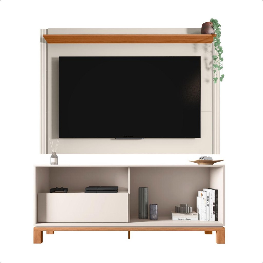 Transforme sua sala de estar com a Bancada e Painel Jace da Caemmun. Com design moderno e funcional, a Bancada acomoda TVs de até 55 polegadas, possui duas portas de correr com detalhes únicos, amplo espaço interno e é produzida em MDP de alta qualidade. Os pés cavalete com base elevada conferem um toque contemporâneo ao móvel. Combine com o Painel Mondrian que além de extensível, garante um ambiente ainda mais completo e elegante. Dimensões dos Produtos Painel: - Peso: 20,2 kg; - Altura: 108 cm; - Largura: 136 cm / 150 cm / 180 cm; - Profundidade: 175 cm. Bancada: - Peso: 31,6 kg; - Altura: 61,9 cm; - Largura: 150 cm; - Profundidade: 36 cm. Características Técnicas Painel: - Possui 1 Prateleira; - Tonalidade do Produto: Off White/Freijó; - Estrutura em MDP de 12mm, 15 mm de espessura. Bancada: - Possui 1 Gaveta; - Possui 2 Nichos; - Possui 1 Prateleira; - Possui 1 Porta de Correr; - Tonalidade do Produto: Off White/Freijó; - Estrutura em MDP de 15mm, 25mm de espessura. HDF de 2,5mm de espessura. - Acompanha manual de montagem; - Garantia 90 dias contra defeito de fabricação; - Este móvel chegará em sua casa separado em 2 volumes. Dimensões dos Volumes 1º Volume: - Altura: 70 cm; - Largura: 141,7 cm; - Comprimento: 39,7 cm. 2º Volume: - Altura: 90 cm; - Largura: 156,7 cm; - Comprimento: 44,7 cm. Recomendações de limpeza: - Limpar com pano macio, seco ou úmido, sem uso de produtos abrasivos. Pois, podem trazer danos ao produto. Sobre a entrega: - As transportadoras contratadas, não realizam entregas em apartamentos. Realizando assim a entrega na portaria do prédio. *Produto segue desmontado, montagem por conta do comprador; *Imagens do produto são meramente ilustrativas.