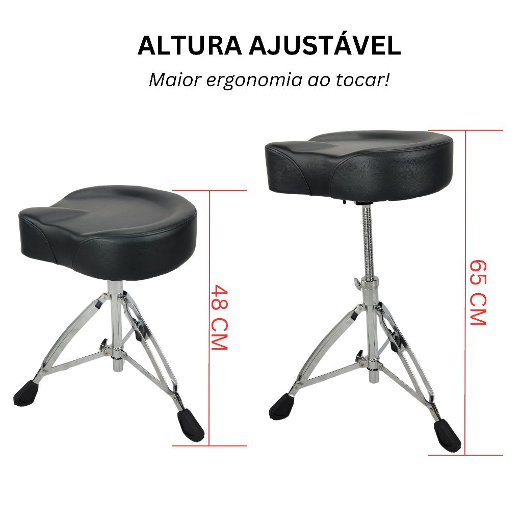 Banco Selim Konig Com Regulagem A Rosca O equilíbrio perfeito entre conforto e estabilidade. Com assento ergonômico em couro sintético e estrutura de ferragem dupla reforçada, este banco oferece a ergonomia e durabilidade necessárias para uma performance segura. CARACTERÍSTICAS DO PRODUTO: • Formato: Selim • Material do assento: Couro sintético de alta resistência • Diâmetro do assento: 40 cm • Base: 3 pés com ferragem dupla e sapatas de borracha antiderrapantes • Suporta até 150kg • Cor: Preto REGULAGEM DE ALTURA: Ajuste contínuo e preciso através de sistema de rosca central: • Altura mínima: 48 cm • Altura máxima: 65 cm ACOMPANHA: ° Assento formato selim ° Base tripé com ferragem dupla ° Eixo central roscado para regulagem POSSUI: ° Sistema de ajuste por rosca espiral (evita que o banco ceda durante o uso) ° Estrutura de metal reforçado ° Travas de segurança e pés emborrachados para máxima aderência no palco ou estúdio DIFERENCIAIS: ° Montagem rápida e prática ° Assento amplo que reduz a fadiga muscular em longas sessões de estudo ou show ° Equilíbrio ideal proporcionado pelo design da base de três pés ° Excelente custo-benefício: estabilidade profissional com a qualidade reconhecida da marca Konig SEGURANÇA E GARANTIA: ° Compra 100% segura com nota fiscal e garantia de 90 dias contra defeitos de fabricação. ° Satisfação garantida — ou devolução gratuita em até 7 dias.
