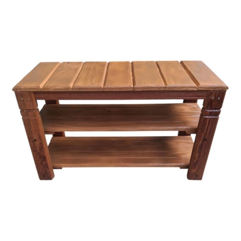 Banco sapateira modelo ripado, com estrutura em angelim, e tampo ripado em pinus, lixado, pintado, envernizado. Montagem simples: apenas parafusar os pés, com uma chave Philips. ( 3 minutos, tempo de montagem): Enviamos assim para disponibilizar um valor viável ao consumidor, amontado sairia muito caro o frete, devido ao peso bruto do produto. Tamanho: 70 cm comprimento; 30 cm largura; 42 cm altura; Suporta 150 quilos; Envio seguro, via correios.