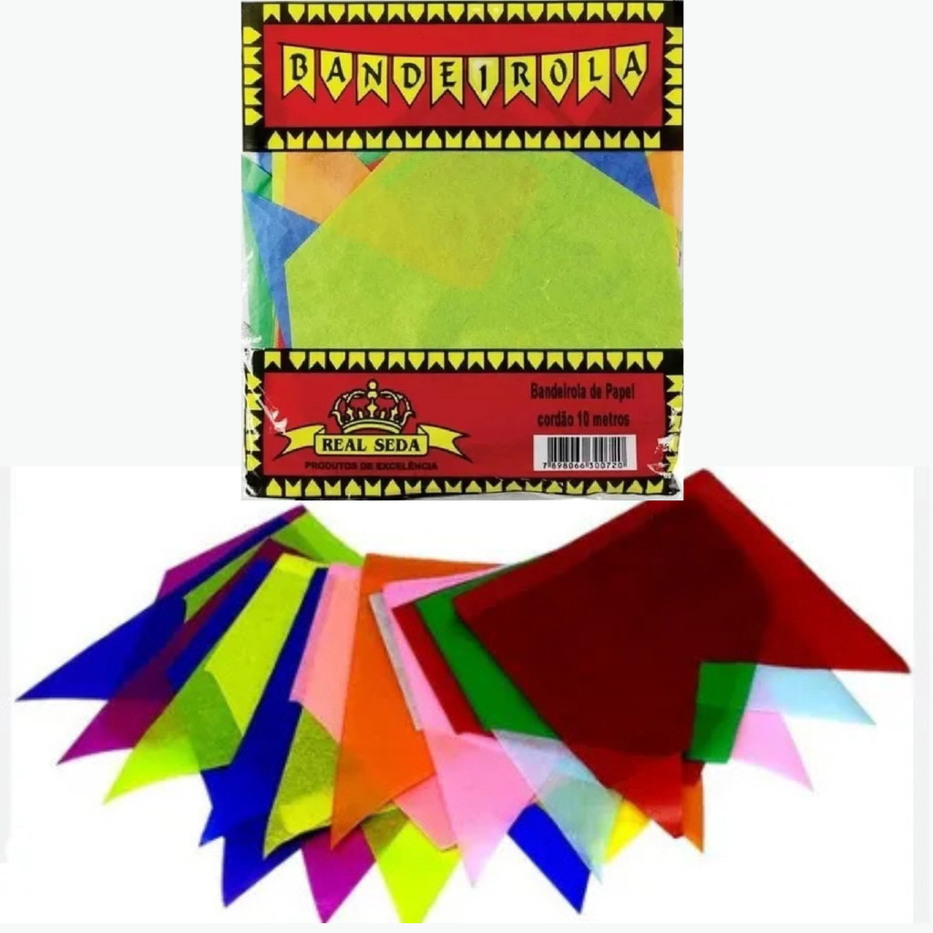 **Especificações técnicas:** * Marca: Real Seda * Código: 487867 * Referência: 47414 * Tamanho: 17 x 17,5cm * Comprimento: 10 Metros * Embalagem: 1 Unidade **Descrição:** Leve a alegria das festas juninas para onde quiser com nossas bandeirinhas coloridas de 10 metros de comprimento! Com um baixo preço que cabe no seu bolso, você pode decorar seu espaço com muito mais charme e diversão. Feitas com material resistente, são perfeitas para pendurar em áreas internas ou externas, garantindo um clima de arraiá o ano inteiro. Aproveite e deixe sua festa ainda mais animada com nossas bandeirinhas!