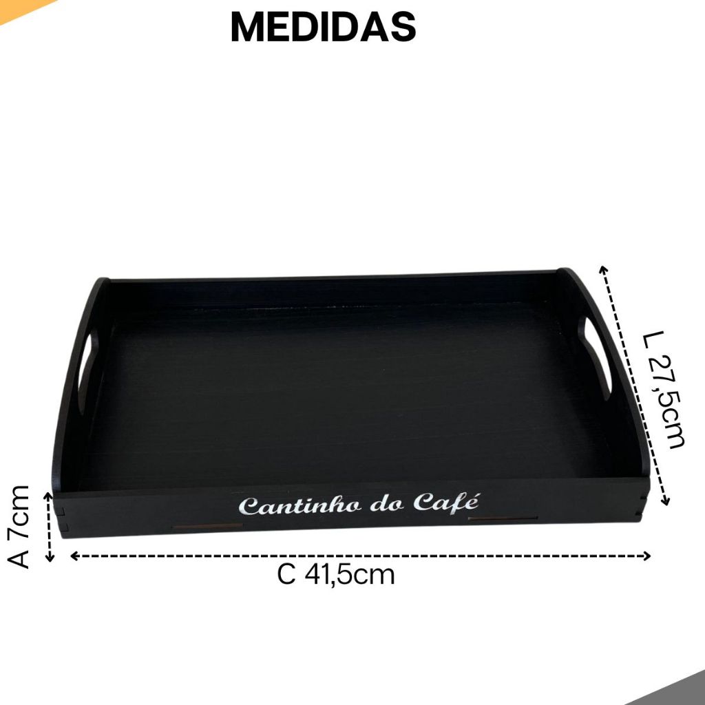 Nossa Bandeja e Perfeita para servir o café na cama, lanche da tarde ou até mesmo compor a decoração de sua Mesa. Seu design moderno e textura delicada atende perfeitamente as necessidades das cozinhas modernas, servindo com elegância. Ideal para Servir um delicioso café para aquela pessoa especial, ou refeições práticas ao ar livre. Medidas Internas Aproximadas: 7 x 27 x 41 (Alt. x Largura x Comprimento) Medidas Externas Aproximadas: 7,5 x 27,5 x 41,5 (Alt. x Largura x Comprimento) ACABAMENTO Nossos produtos são fabricados em MDF cortados a laser com aplicação de pintura de alta qualidade. As Bordas laterais serão na cor preta resultado proveniente do corte da maquina laser Limpeza do Produto: Observação ( Não utilizar produtos químicos ou solventes ) para garantir a durabilidade do produto
