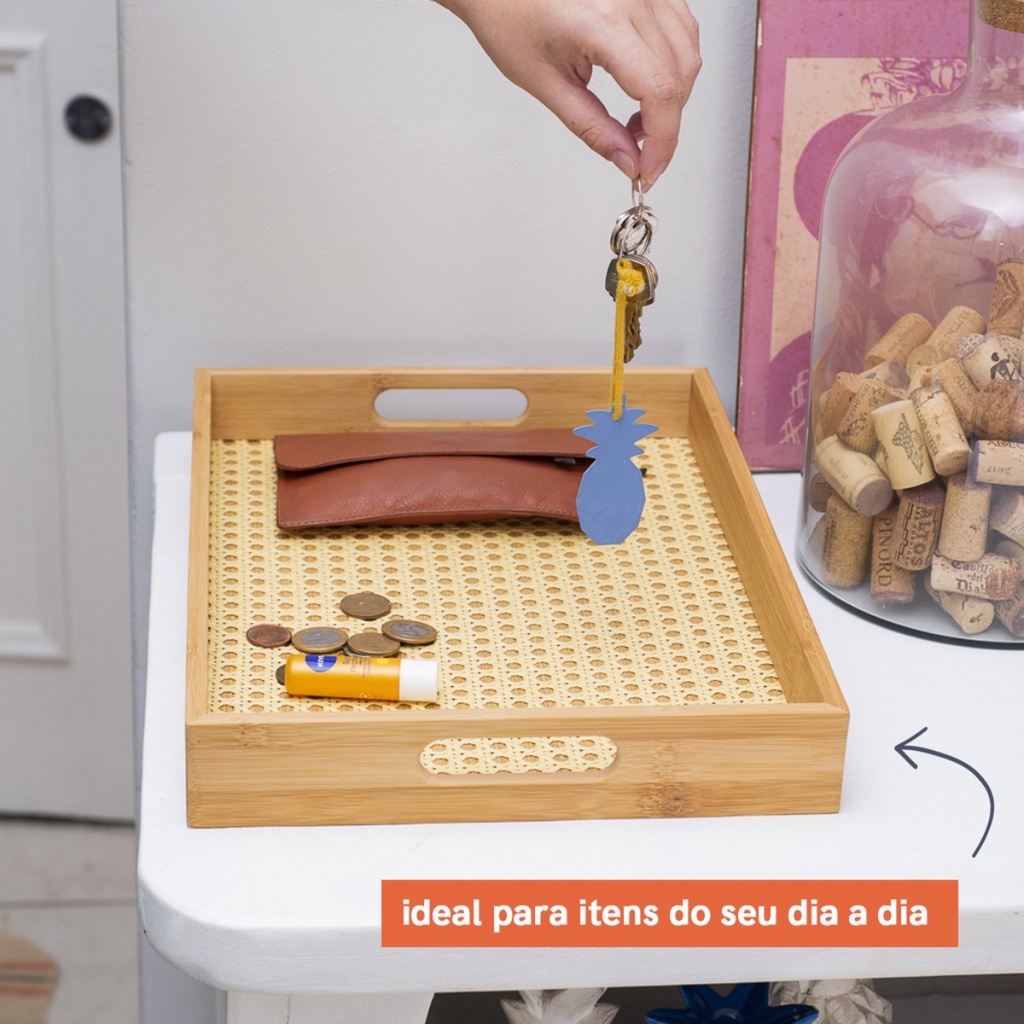 Bandeja de Bambu c/ Palha Indiana Para Servir Café da Manhã Decorativa Multiuso Retangular