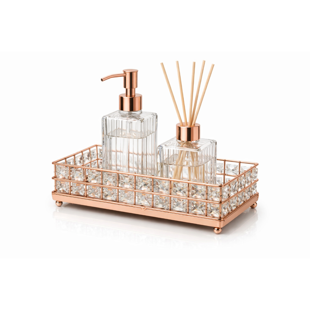 Fabricada em metal de alta qualidade, com acabamento premium nas cores Rose Gold ou Prata, a bandeja possui laterais decoradas com cristais facetados, que refletem a luz e valorizam ainda mais o ambiente. Ideal para organizar difusores, saboneteiras, perfumes, frascos de lavabo, cosméticos ou objetos decorativos. Seu design moderno e elegante é perfeito para quem busca uma decoração refinada, sendo muito utilizada em lavabos, banheiros, penteadeiras, aparadores e ambientes de alto padrão. 📐 ESPECIFICAÇÕES Material: Metal base espelhada com cristais decorativos Cores disponíveis: Rose Gold e Prata Comprimento: 20 cm Largura: 10 cm Altura: 5,5 cm Acabamento premium e base elevada com pés metálicos ✨ VANTAGENS ✔ Design luxuoso e sofisticado ✔ Ideal para lavabo, banheiro e decoração ✔ Valoriza frascos e itens decorativos ✔ Excelente para kits de lavabo ✔ Perfeita para presentear