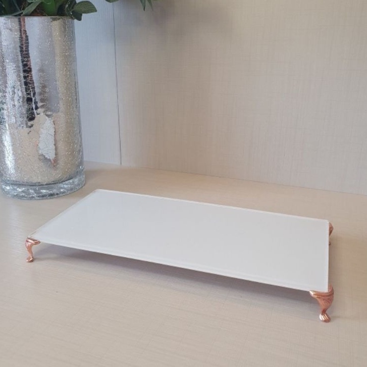 Bandeja de Vidro Branca com PÉ METAL em Rose/Prata/Dourado KIT LAVABO DECORAÇÃO 12 X 23