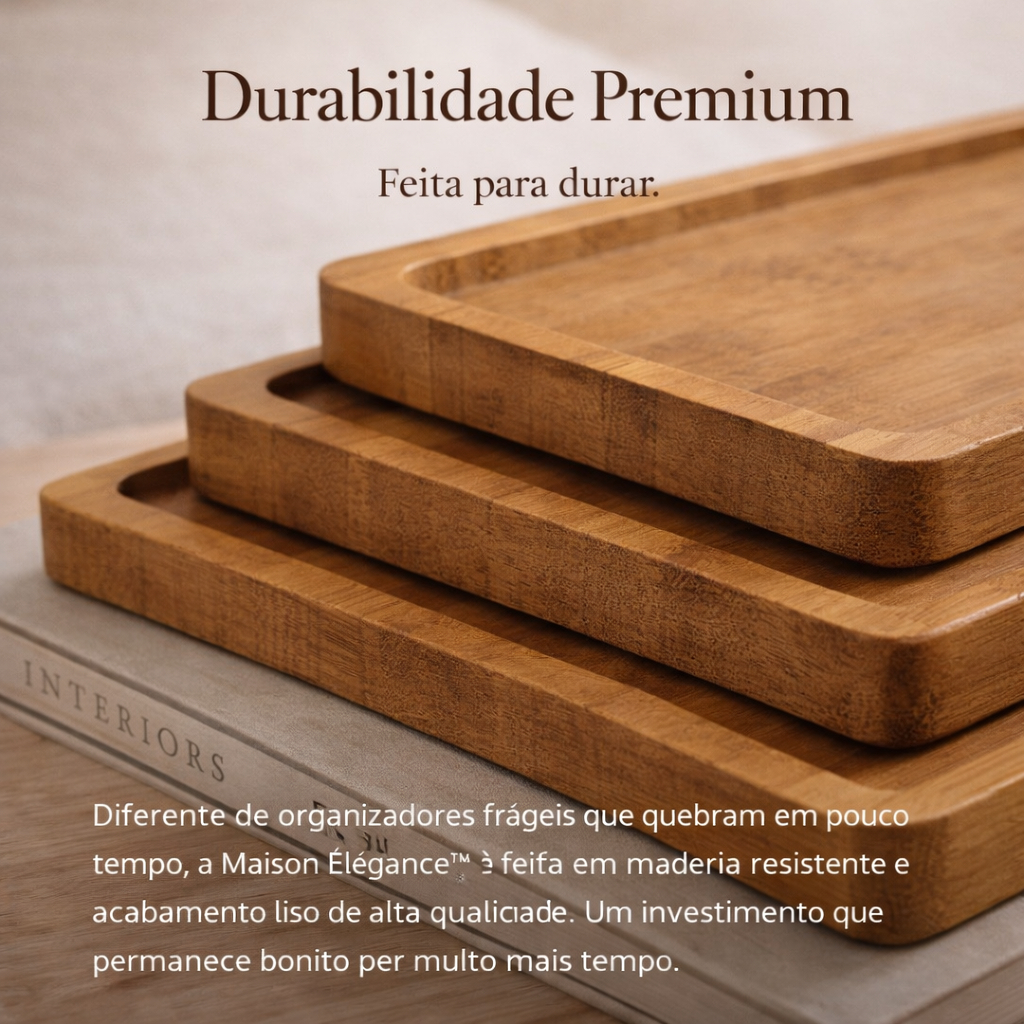 Bandejas Decorativas Maison Élégance™ Organização com Sofisticação Instantânea Transforme qualquer ambiente da sua casa com a elegância atemporal da madeira natural. As Bandejas Maison Élégance™ foram criadas para unir organização e decoração em uma única peça, elevando o padrão do seu espaço sem esforço. Chega de bancadas desorganizadas e objetos espalhados que passam sensação de bagunça. Com design minimalista e acabamento refinado, elas organizam instantaneamente café, perfumes, velas, temperos ou itens decorativos — criando um ambiente harmonioso, sofisticado e digno de elogios. ✨ Destaques do Produto ✔ Organização Inteligente – Deixe sua cozinha, sala ou lavabo visualmente organizados em segundos. ✔ Elegância Natural – Madeira com acabamento liso e textura sofisticada que valoriza qualquer ambiente. ✔ Durabilidade Premium – Material resistente, feito para durar e manter a beleza por muito mais tempo. ✔ Versatilidade Total – Ideal para servir café, organizar perfumes, montar cantinho do café ou compor decoração. ✔ Design Atemporal – Combina com estilos moderno, minimalista, escandinavo e rústico. ✔ Três Tamanhos Estratégicos – Perfeitos para diferentes usos e composições. 🏡 Ideal Para Bancadas de cozinha Cantinho do café Mesas de centro Lavabos e banheiros Organização de perfumes e cosméticos Decoração com velas e objetos especiais 🌿 Diferencial Maison Élégance™ Diferente de organizadores plásticos comuns, a Maison Élégance™ não apenas organiza — ela valoriza o ambiente, cria pontos de destaque e transmite sensação de casa bem cuidada e sofisticada. É o detalhe que transforma uma casa comum em uma casa que recebe elogios. 📏 Especificações Material: Madeira natural de alta qualidade Acabamento: Liso, resistente e refinado Disponível em: 3 tamanhos Uso: Decorativo e organizacional 🎁 Edição Limitada Produzida em lote especial. Garanta a sua antes que o estoque se esgote.