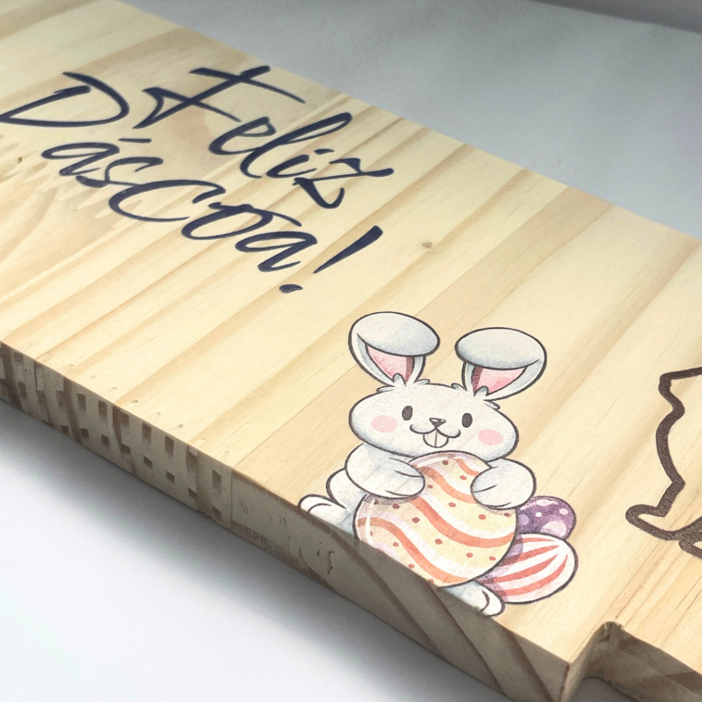 Bandeja Decorativa em Madeira Pinus Coelhinhos Feliz Páscoa Decoração Mesa Posta