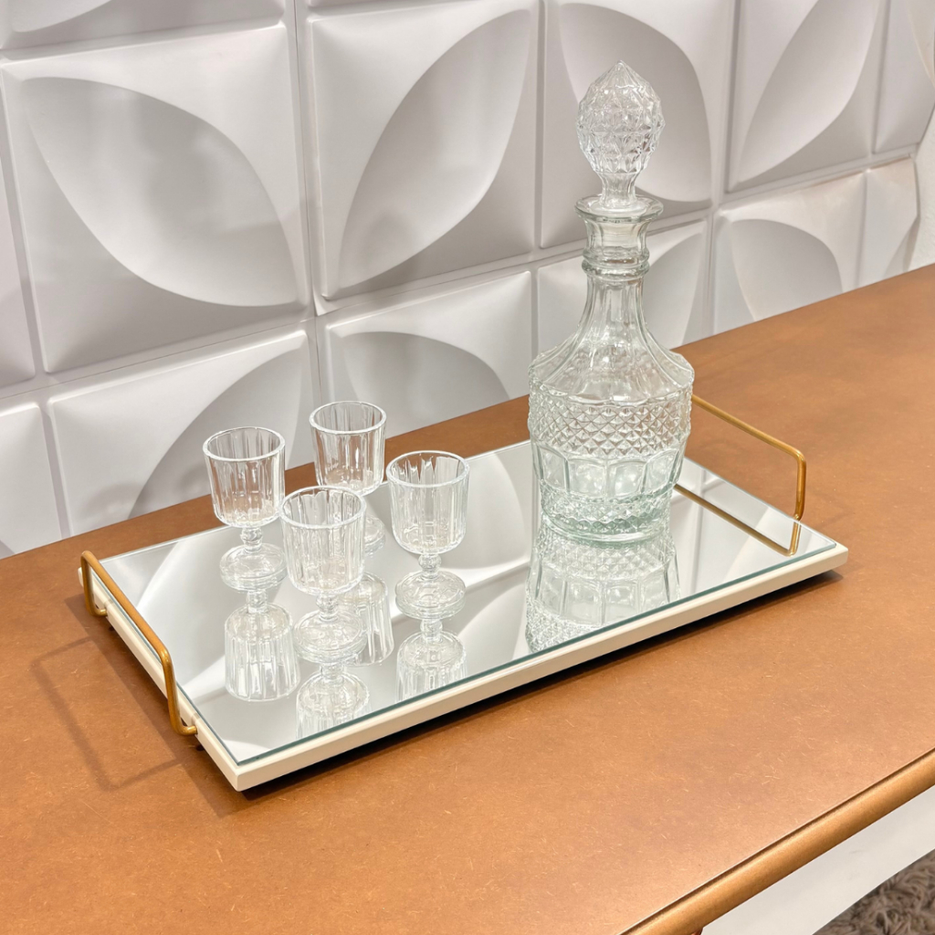 Bandeja Premium Espelhada – Elegância em Laca e Ferro Maciço Transforme o seu cantinho do café ou aparador com o toque de luxo que ele merece! Nossa bandeja exclusiva une o brilho do acabamento laqueado à resistência da alça em ferro, criando uma peça atemporal e extremamente refinada. * Acabamento Impecável: Estrutura em MDF com pintura Laqueada de alto padrão. * Durabilidade: Alças em ferro maciço com pintura eletrostática (não descasca e não enferruja). * Design de Luxo: Fundo em espelho de alta qualidade que amplia e destaca seus objetos. * Versatilidade: Perfeita para organizar cafés, bebidas, perfumes ou servir com estilo. Dimensões: Maior Comprimento: 45cm Largura: 26cm Altura: 6cm Menor Comprimento: 40cm Largura: 25cm Altura: 6cm Garanta a sua e mude o visual da sua casa hoje! Atenção: Produtos decorativos são ilustrativos e não acompanham o produto. Agradecemos a visita :)