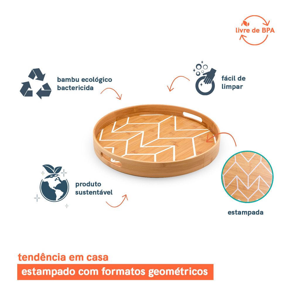 :: multiuso: pode ser usada tanto para servir comes e bebes, quanto para deixar seus itens organizados. :: decorativa: ela combina com qualquer lugar da casa. até pendurada na parede, essa bandeja se dá bem. :: durável e higiênica: o bambu é um material resistente e com propriedades que evitam a proliferação de bactérias. dura muito mais! :: essa é a bandeja em bambu redonda estampada da OIKOS.