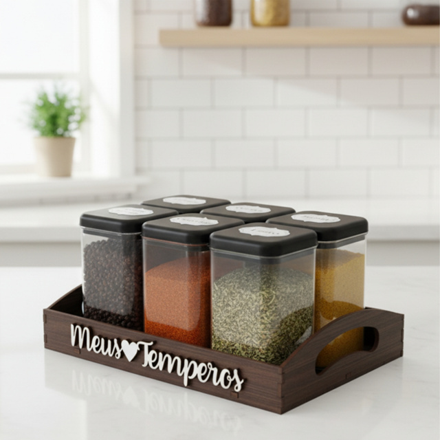 Bandeja Meus temperos organizadora 6 Potes em Mdf decorado Porta Condimentos Mantimentos Original
