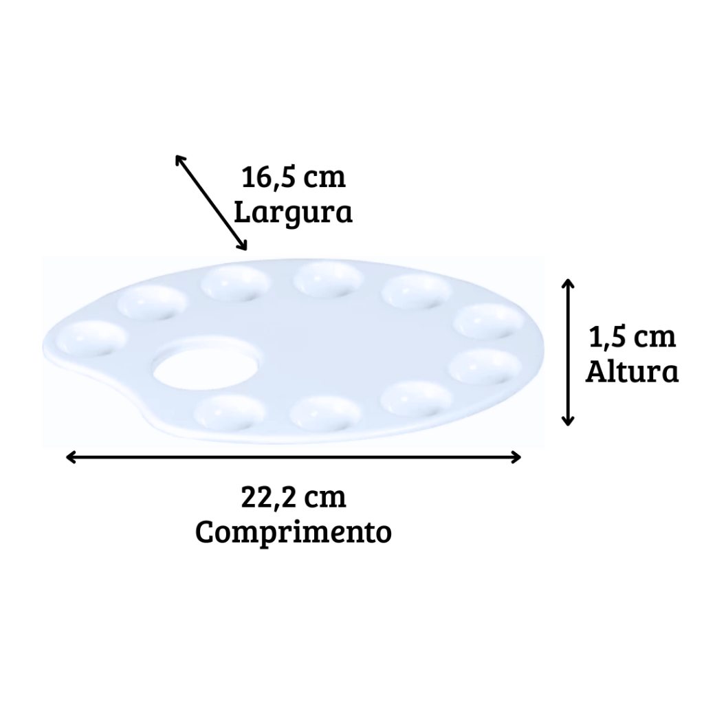 A Paleta Godê Condor é prática e funcional, ideal para artistas que precisam trabalhar com várias cores ao mesmo tempo. >> Características principais: • Possui 10 cavidades para acomodar diferentes tonalidades com organização. • Conta com um orifício para encaixe do dedo polegar, oferecendo firmeza e conforto no manuseio. • Fabricada em plástico branco, leve e fácil de limpar. • Dimensões aproximadas: 22,2 × 16,5 × 1,5 cm. >> Utilização recomendada: • Indicada para tintas aquosas como acrílica e guache, permitindo o uso simultâneo de até 10 cores. O encaixe para o polegar facilita a movimentação enquanto se pinta.