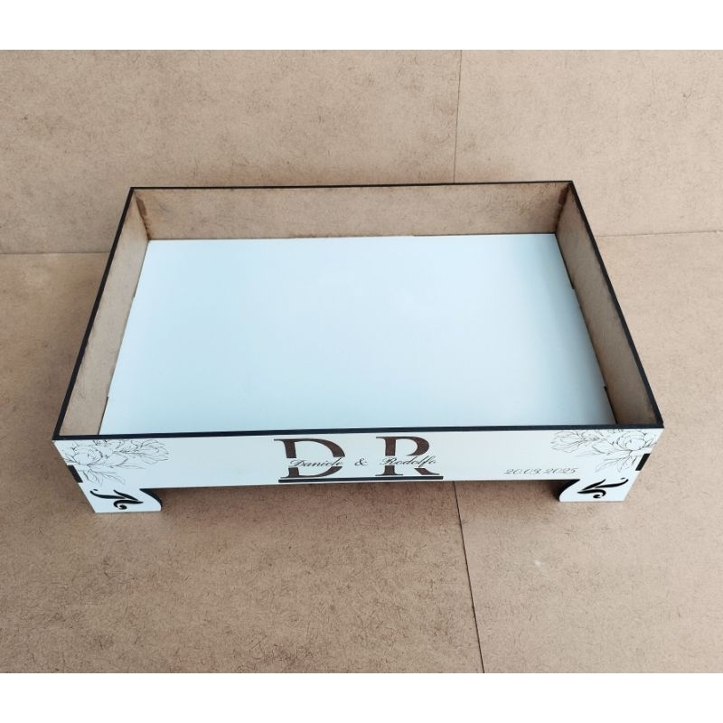 Casamento Abençoado Uma bandeja personalizada para Kit Toalete Casamento em MDF Medida: 20cm x 30cm x 7cm MDF 3mm pintura industrial branca uma face outra face cru Pode personalizar os nomes,data, versículo, frase... enfim, pode personalizar de várias formas, basta enviar como deseja personalizar no chat. - A base pode ser branca ou cru, depende do estoque - É necessário dar um pinguinho de cola nos encaixes para fixar as peças - É enviado desmontado Qualquer dúvida estamos à disposição para atendimento no chat!!