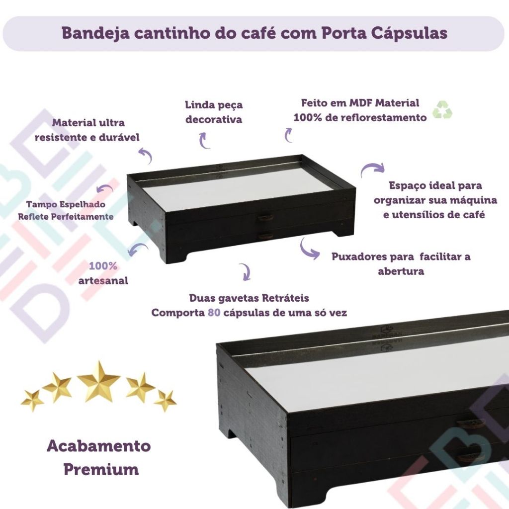 Apresentamos a nossa incrível Bandeja decorativa Preta Cantinho do café com porta 80 Capsulas Embutido e Fundo Espelhado. Se você é apaixonado por café e adora decorar sua casa, escritório ou recepção, temos uma novidade incrível para você: a Bandeja Cômoda Cantinho do Café, um produto perfeito para complementar seu ambiente e transformar seu momento de café em algo ainda mais especial. Comporta 80 cápsulas, sendo 40 capsulas em cada gaveta e está disponível para todas as máquinas de café, EXCETO PARA O MODELO VERTUO DA NESPRESSO. Selecione variação de acordo com a sua máquina!! Garanta já a sua e tenha uma combinação perfeita de elegância e funcionalidade na sua vida diária. Material: Mdf de excelente QUALIDADE Acrílico Pintura Medidas: Altura: 15cm Comprimento: 50cm Largura: 30cm DÚVIDAS FREQUENTES? Qual espessura do mdf? -Espessura de 4mm. O material é frágil? -Não, já fizemos o teste com uma pessoa de quase 100kg encima e aguentou perfeitamente! Quais tipos de cápsulas é compatível? -Compatível com dolce gusto, três corações e nespresso (EXCETO PARA O MODELO VERTUO DA NESPRESSO). Qual a capacidade de cápsulas? -Tem capacidade de 80 cápsulas, sendo 40 cápsulas para cada gaveta. *Duas Bandejas Retráteis, Comporta 80 cápsulas de uma só vez *Feito em MDF Material 100% de reflorestamento *100% artesanal *Espaço ideal para organizar sua máquina e utensílios de café *Linda peça decorativa *Puxadores para facilitar a abertura *Material ultra resistente e durável Decoração para casa, Decoração para cozinha, Decoração para sala, Decoração para Cantinho do Cafe, Decoração para escritório, Decoração para espaço do café, Item decorativo para Cantinho do Cafe Envio imediato para todo o Brasil. SOMOS LOJA FISICA! Oferecemos Garantia, compre com total tranquilidade. Oferecemos o melhor atendimento! Estamos a disposição no chat para esclarecer qualquer dúvida e trabalhamos para garantir a melhor experiência para todos os nossos clientes. OBS: Não acompanha itens de decoração das fotos. EMBALAGEM: Embalamos nossos produtos seguindo todos os protocolos de segurança, além de muito cuidado e carinho para que ele chegue na sua casa perfeito, sem nenhuma avaria. Mas caso algo não ocorra conforme o esperado, não se preocupe! Estamos aqui para resolver o mais rápido possível, é só entrar em contato.