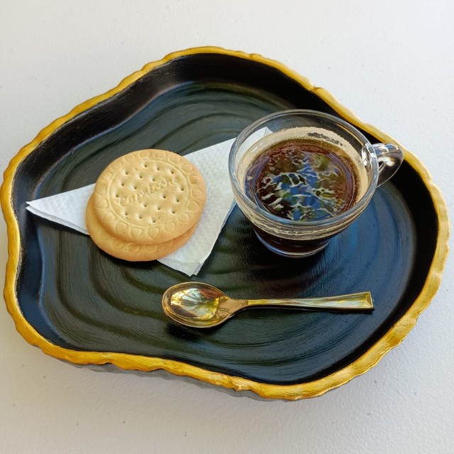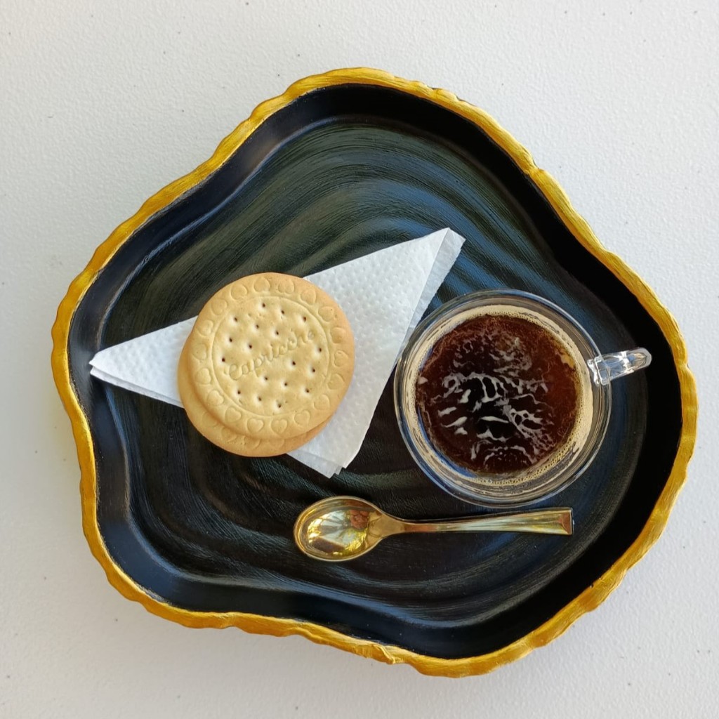 Bandeja preta e dourada para servir cafezinho - Kit café completo 21cm