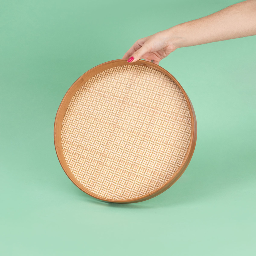 Bandeja redonda de bambu 35cm com alça palha xadrez multiuso - Oikos
