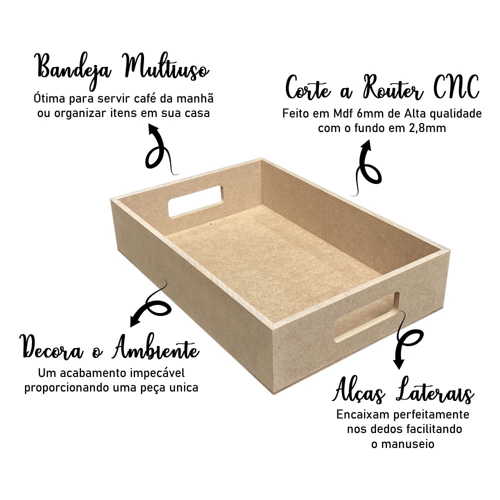 Bandeja Retangular Com Alça Ela tem como propósito atender suas necessidades tanto para servir café da manhã, quanto organizar itens em sua casa. Cortada na Router CNC, ela proporciona um acabamento único, enfeitando e decorando o seu espaço. Produzido em mdf 6mm de Alta qualidade, com o fundo em Mdf 2,8mm. - Medidas Externas: - Comprimento: 30cm - Largura: 20cm - Altura: 6cm - Caso tenha qualquer dúvida fique a vontade para perguntar, estamos à disposição para lhe atender.