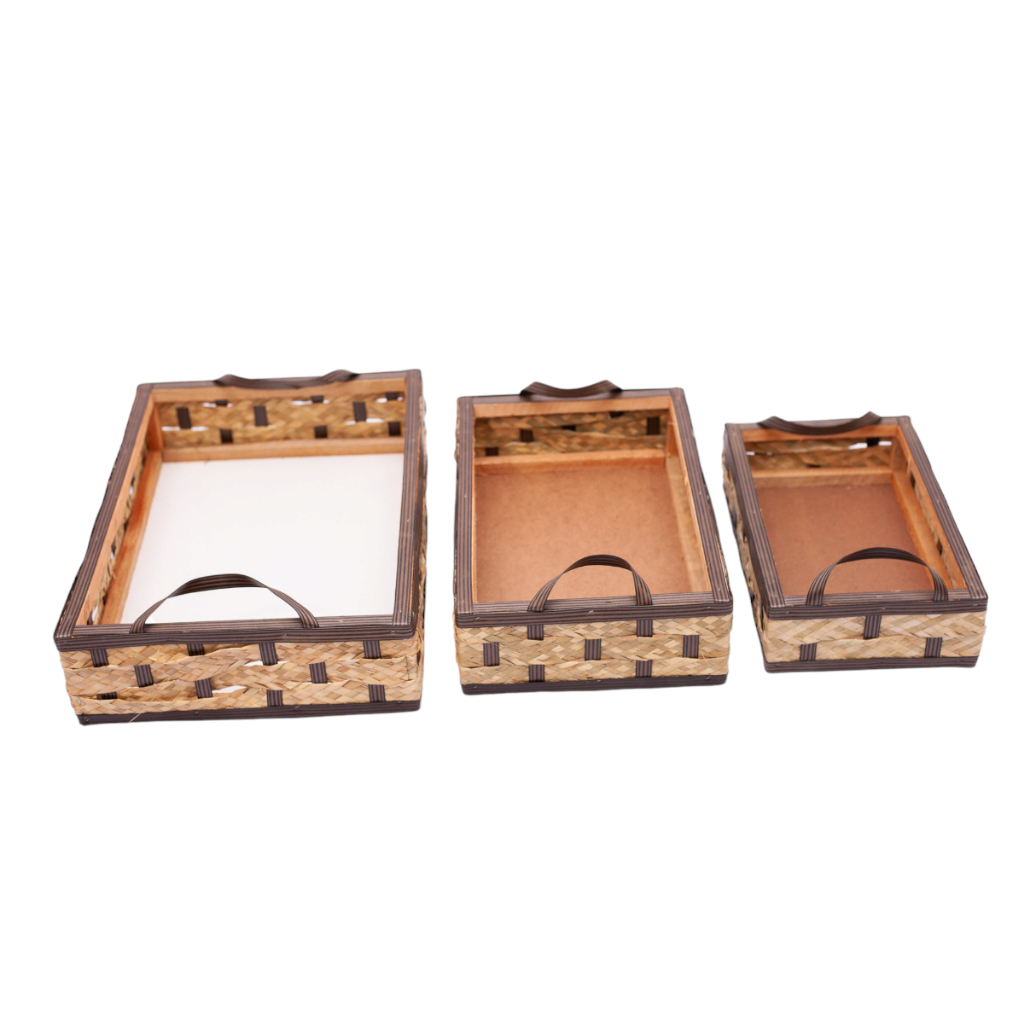 As bandejas são capazes de dar um toque todo especial à sua sala de estar. Elas podem ser usadas para expor souvenirs, bibelôs e outros artigos decorativos. É possível até usar as bandejas como revisteiros ou transformá-las em belos centros de mesa. Medidas: P - 32x20x08 M - 38x25x9,5 G - 45x32x10 (POR SER UM PRODUTO ARTESANAL AS MEDIDAS PODEM VARIAR EM ATÉ 2CM)