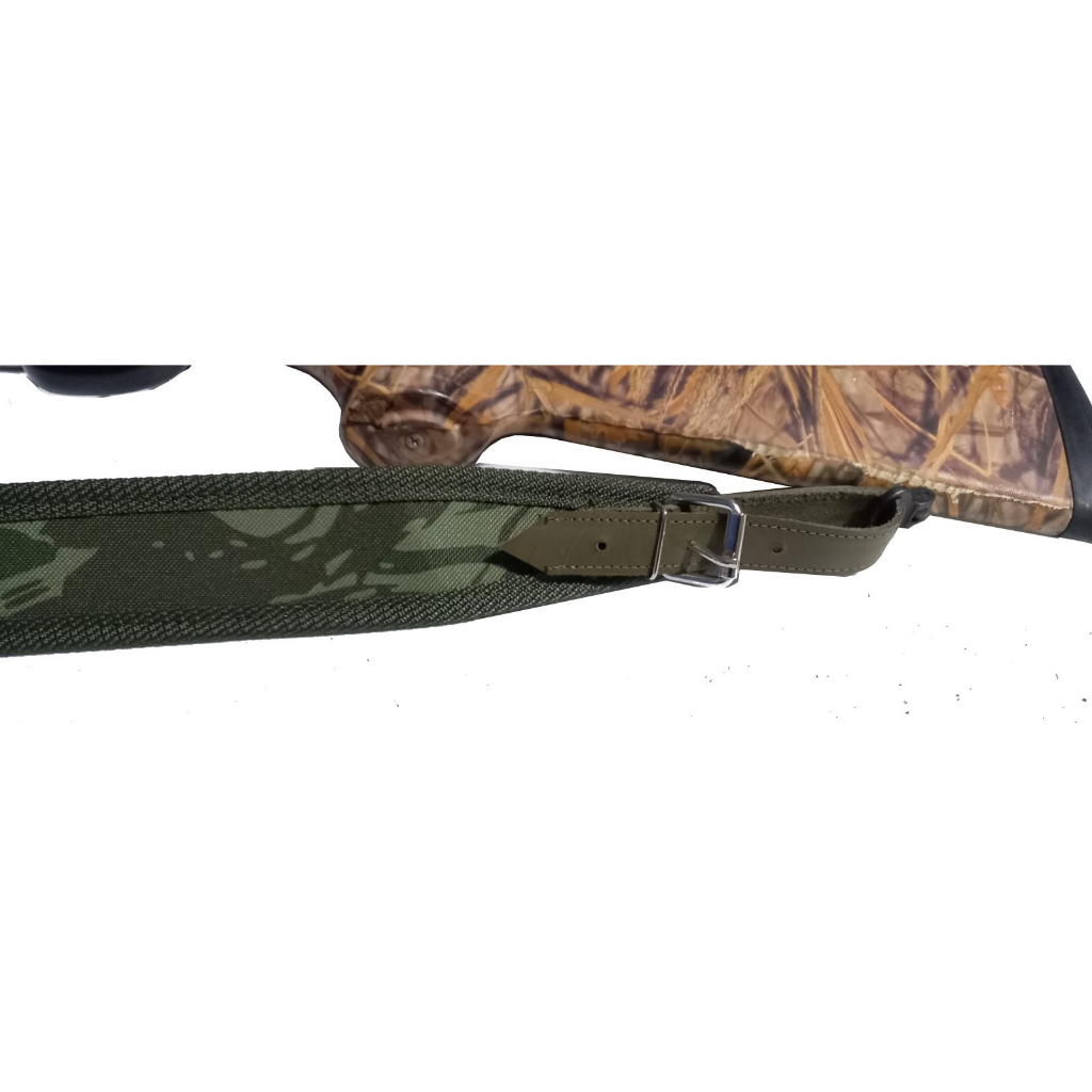 Envio imediato, produto à pronta entrega. Especificações do produto: Bandoleira duas pontas em nylon, com fita de nylon no contorno para maior resistência e durabilidade, com fivelas de ferro e pontas em couro legítimo, para uso em atividades ao ar livre. Comprimento total aproximado de 1,20 metros. Largura de 5 cm. Largura da ponteira 2cm. Material: nylon e couro nas pontas. Cor: camuflada ou preta. 3 níveis de regulagem: Primeira - 91 cm Segunda - 94 cm Terceira - 98 cm