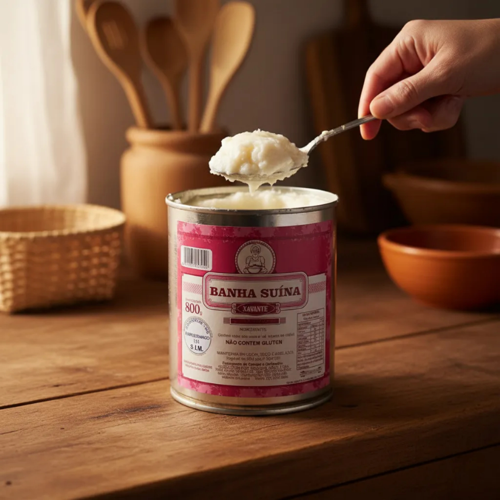 Banha na lata Xavante 800g =================================================================================== Cozinhar com banha de porco é mais saudável do que com óleos vegetais, diz especialista. Assim como a manteiga, o azeite e óleo de coco, a banha de porco é rica em graxos monoinsaturados, ou seja, é mais estável ao ser submetida ao calor, sendo mais difícil de sofrer oxidação. ===================================================================================