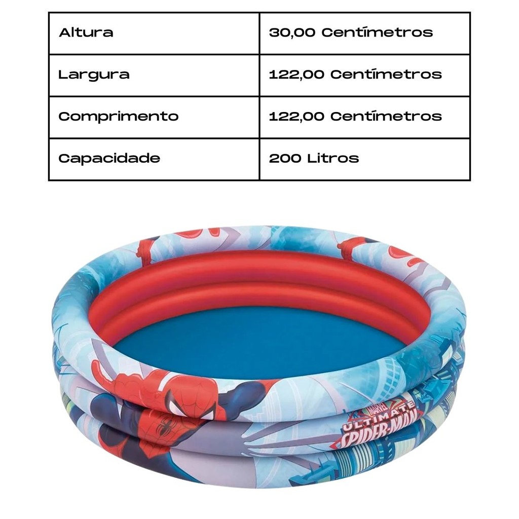 Banheira Inflável Mor 200L Homem-Aranha Para Crianças PRODUTO ORIGINAL À PRONTA ENTREGA A Banheira Inflável Mor 200L Homem-Aranha é ideal para garantir a diversão das crianças nos dias quentes. Com capacidade para até 200 litros de água e diâmetro de 1,22 metros, proporciona espaço suficiente para brincadeiras seguras e refrescantes. Produzida em vinil resistente, conta com três câmaras de ar independentes, aumentando a estabilidade e segurança durante o uso. Além disso, acompanha kit de reparo para pequenos ajustes. Características do produto: Capacidade de 200 litros Dimensões: 1,22m x 1,22m x 30cm Material resistente e durável Três câmaras de ar para maior segurança Fácil de transportar e armazenar Recomendada para crianças a partir de 2 anos, sempre com a supervisão de um adulto. Perfeita para uso no quintal, na praia ou em viagens.