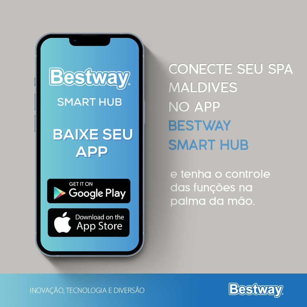 Você está comprando um produto Bestway original, da Bestway Store, sua loja oficial no Brasil! Quem somos: Há mais de 28 anos, a Bestway foi fundada com uma visão clara: criar diversão e experiências memoráveis para todos por meio dos produtos e serviços que oferecemos. Estamos presentes em todo o MUNDO, incluindo os Estados Unidos, França, Itália, Alemanha, Austrália, China e em mais de 120 PAÍSES, com a operação de seis fábricas próprias. Continuamos comprometidos com a qualidade e a inovação em todos os nossos produtos, mantendo-nos constantemente atualizados e acompanhando o que há de novo. >>> Aproximadamente 1 dentre 50 pessoas em todo o mundo possui um produto Bestway! Descubra o Lay-Z-Spa Maldives Smart Luxe HydroJet Pro, o spa inflável perfeito para até 7 pessoas, que combina luxo, tecnologia e conveniência num só produto. Desfrute de uma experiência de hidromassagem relaxante e rejuvenescedora no conforto da sua casa, com uma montagem simples e rápida, sem necessidade de instalação profissional. Lay-Z-Spa é o criador do primeiro spa portátil premium do mundo, com mais de uma década de inovações e engenharia avançada. Confie na marca que é sinónimo de qualidade e relaxamento. Especificações: - Capacidade: 5-7 adultos - Capacidade de Água: 1.050 L - Tamanho Inflado: 2,01 m x 2,01 m x 80 cm - Tamanho Interno: 1,51 m x 1,51 m - Peso Cheio: 1.115 kg - Caudal Real de Água: 1.325 L/h - Máx. Capacidade de Aquecimento: 40℃ - Sistema de Aquecimento: 1.0 - 1.5˚C / h - Peso Líquido: 65 kg - Profundidade Máxima da Água: 58 cm - 127V ou 220V (selecione a voltagem). Conteúdo: - 1 Spa inflável - 1 Cobertura de piscina - 1 Bomba de spa - 1 Distribuidor ChemConnect - 5 Almofadas - 1 Cartucho filtrante (VI) - 2 Luzes LED alimentadas por água - 1 Remendo de reparação - Sistema HydroJet Pro Perguntas Frequentes: O que é o Lay-Z-Spa Inflável Maldives Smart Luxe HydroJet Pro? É um spa inflável de luxo e alta tecnologia, perfeito para até 7 pessoas. Ele oferece uma experiência de hidromassagem relaxante e rejuvenescedora no conforto da sua casa, com montagem simples e rápida, sem necessidade de instalação profissional. Como posso controlar o meu Lay-Z-Spa Maldives? Você pode controlar todas as funções do seu spa de forma inteligente e conveniente através da aplicação Bestway Smart Hub no seu dispositivo móvel, de qualquer lugar. Quais funções posso controlar pelo aplicativo? Pelo aplicativo, você pode ajustar a temperatura (até 40°C), programar o temporizador de poupança de energia, ativar o sistema de filtragem e controlar os sistemas de massagem HydroJet Pro. Como funciona o sistema de massagem HydroJet Pro? O sistema de massagem HydroJet Pro oferece um relaxamento duplo com: - 8 potentes bicos HydroJet: Jatos de água direcionados para uma massagem localizada e intensa. - 180 saídas AirJet: Bolhas suaves liberadas do fundo do spa para massagear os pés e as costas, criando uma sensação efervescente. Você também pode escolher entre 2 níveis de intensidade com o regulador de massagem. O spa é durável? Como é sua construção? Sim, o Lay-Z-Spa inflável Maldives é projetado para durar, com materiais de alta qualidade: - Vigas internas de tecido MaxHold: Garantem retenção de pressão de ar superior, estabilidade e leveza. - Paredes DuraPlus de 3 camadas: Comprovadamente resistentes a furos e danos, oferecendo durabilidade excepcional. O que o Lay-Z-Spa inflável Maldives oferece em termos de conforto? Ele proporciona o máximo conforto com assentos internos insufláveis e almofadas acolchoadas, ideais para longas sessões de relaxamento. Além disso, conta com luzes LED ColorJet que alternam entre 7 cores para criar um ambiente envolvente. O spa pode ser usado em temperaturas mais frias? Sim! A função de aquecimento automático Freeze Shield protege os componentes internos do spa, evitando o congelamento e danos em temperaturas mais baixas. Este sistema inteligente mantém a temperatura interna entre 6°C e 10°C, garantindo a longevidade do seu spa. Você também pode programar o aquecedor do spa com até 40 dias de antecedência. Quais são os recursos de segurança do spa? Todos os spas Lay-Z-Spa inflável possuem um sistema de deteção de terra que garante o uso com uma tomada aterrada, oferecendo proteção adicional contra a corrente elétrica. Como é feita a manutenção do spa? A manutenção é fácil e conveniente: - Possui uma bomba multifuncional que infla, aquece, filtra e controla o sistema de massagem, com porta-copos integrados. - O Dispensador ChemConnect garante que a água permaneça limpa e saudável, liberando a quantidade certa de cloro de forma uniforme. - Inclui uma cobertura reforçada para bloquear o calor quando não estiver em uso e proteger contra poeira e detritos.