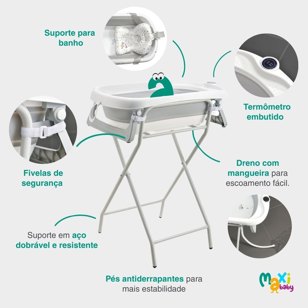 Banheira Para Bebê Dobrável Com Suporte e Termômetro Wish Branco - Maxi Baby A Banheira Dobrável com Suporte para Bebês é a combinação perfeita entre segurança, praticidade e conforto para a rotina de cuidados com os pequenos. Desenvolvida para bebês de 0 a 3 anos (até 15 kg), ela traz um design moderno e inteligente, pensado para facilitar o dia a dia das famílias sem abrir mão da tranquilidade e do bem-estar do bebê. Conta com estrutura ergonômica e termômetro embutido, permitindo o controle ideal da temperatura da água. Almofada suporte de poio interno acolchoado removível oferece maior conforto ao bebê durante o banho, enquanto as 4 fivelas de segurança e os pés com base antiderrapante garantem firmeza e estabilidade ao suporte dobrável em aço. Com capacidade para até 40 litros de água, a banheira é resistente, leve e extremamente funcional. Após o uso, pode ser dobrada de forma prática, ocupando pouco espaço, ideal para quem busca soluções compactas para armazenar ou levar em viagens. Além disso, o dreno com mangueira acoplada facilita o escoamento da água, evitando bagunça e otimizando o tempo. Produzida com materiais seguros e livres de BPA e ftalatos, está em conformidade com a norma europeia de segurança EN17072, garantindo ainda mais confiança para os pais. Uma escolha prática, segura e confortável para o cuidado diário com o seu bebê. Principais Características: - Idade recomendada: de 0 a 3 anos (até 15 kg) - Livre de BPA e ftalatos, conforme norma europeia EN17072 - Capacidade da banheira: até 40 litros - Suporte em aço dobrável e compacto com pés antiderrapantes - Termômetro embutido para controle da temperatura da água - Suporte para Banho: Almofada de apoio interna para maior conforto do bebê - Mangueira de drenagem para escoamento prático da água - Acompanha 4 fivelas de segurança, chave allen e chave plana - Fácil de montar, limpar, guardar e transportar Especificações Técnicas: - Conteúdo da Embalagem: 1 Banheira com termômetro embutido, 1 Suporte almofada para banho, 1 mangueira de drenagem, 4 fivelas de segurança, 1 chave allen e 1 chave plana. - Composição/ Material: Suporte em aço, banheira em PP (Polipropileno) + TPE - Dimensões da banheira: 80 cm x 47 cm x 21 cm aprox. - Dimensões do suporte: 80 cm x 50 cm x 91 cm aprox. - Peso Liquido: 3,500 kgs - Garantia: 90 Dias (Contra Defeito de Fabricação Pelo Fabricante) - Código do Fabricante: 21847 - EAN: 7899403218470 - Marca: Maxi Baby Imagens Meramente Ilustrativas! Cores e Modelos podem mudar conforme o lote de fabricação.