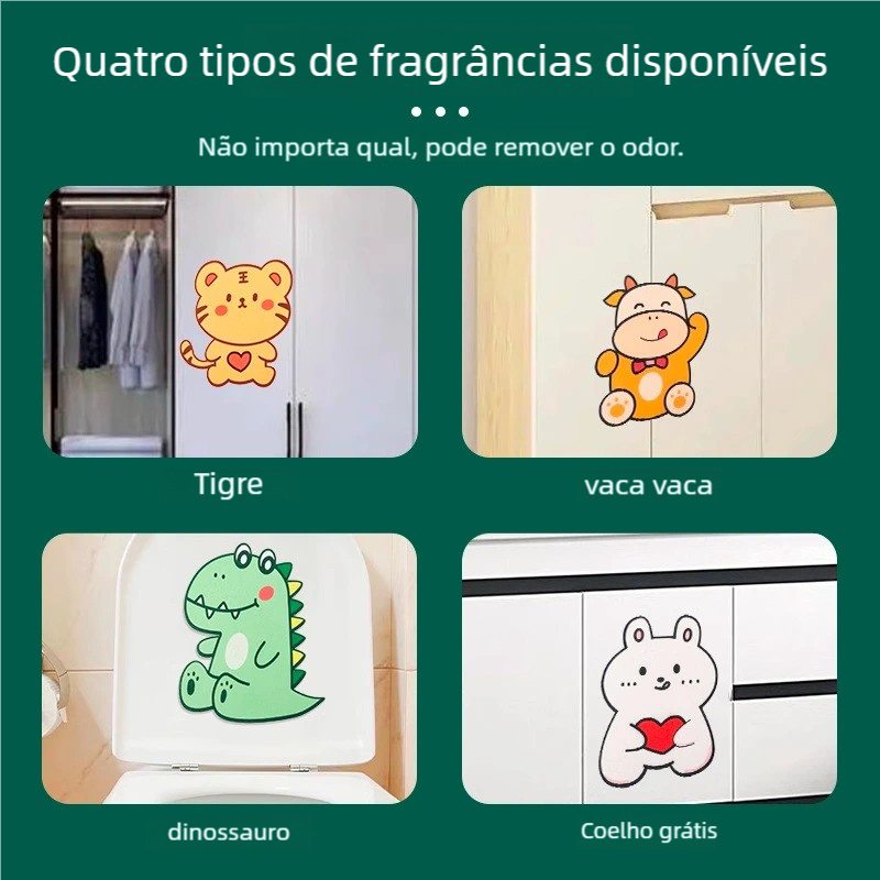 Desodorante adesivo animado para vaso sanitário: prático, econômico e lindo! Aplica em segundos, adesivo resistente à humidade do banheiro. Combate odor eficazmente, mantém o ambiente arejado. Material seguro, não danifica a cerâmica.