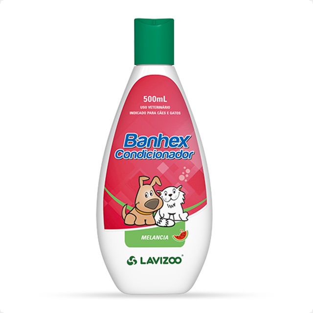 Banhex Condicionador Lavizoo Melancia para Cães e Gatos - 500 mL - Indicado para cães e gatos; - Pelos macios; - Melhora a viscoelasticidade dos pelos; - Perfume delicioso. Detalhes O Banhex Condicionador Lavizoo Melancia - 500 mL, é um produto destinado exclusivamente à higiene e embelezamento em cães e gatos. Dicas Especiais Modo de Uso: Após o uso do Shampoo Banhex, aplicar uma quantidade sobre o pelo do animal e massagear. Em seguida enxaguar com água abundante, evitando contato com olhos, ouvidos e boca. Se necessário repita a aplicação. Indicação: Cachorro, Gatos Porte/Raça: Raça Pequenas, Raças Médias, Raças Grandes Idade: Filhotes, Adultos, Idosos Apresentação: 500 mL