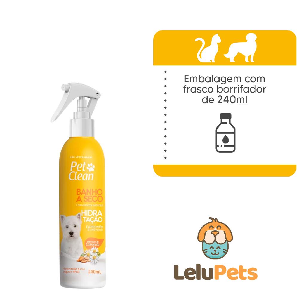 A LeluPets nasceu de uma paixão e dedicação de aproximadamente 20 anos de experiência nessa área tão incrível. Desde o início de nossa história, já são mais de 100 mil clientes atendidos. Estamos aqui determinados em fazer a diferença, democratizando e simplificando o cuidado com o seu pet para oferecer a melhor experiência para você e seu amiguinho. Mantemos nossas orelhas em pé, atentos às novidades do mundo pet para trazê-las até você. Nós somos apaixonados por pets! O seu pet é também da nossa família! Banho a Seco Hidratação Pet Clean Para Cães e Gatos 240 ml O Banho a seco Pet Clean é um produto ideal para higiene de cães e gatos sem a utilização de água. Sua fórmula especial permite uma higienização segura de maneira muito rápida. Indicado para todas as idades, inclusive filhotes a partir de 3 meses. Modo de Usar: Aplique o produto diretamente no pelo do pet (distância de aproximadamente 10 a 15 cm). Espalhe por toda a pelagem com o auxílio de um pano limpo e seco, retirando o excesso . Não é necessário enxaguar. - Camomila e Amêndoas - Cheirinho de Camomila - Higienização a Seco segura e eficaz - Indicado para cães e gatos - Manutenção e embelezamento dos pets - Com ótima ação em maciez - Disponível em embalagem 240ml.