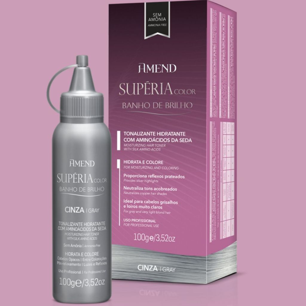 **Descrição:** **Banho de Brilho Amend Supéria Color – Cinza (100g)** O Banho de Brilho Amend Supéria Color na cor Cinza é um tratamento capilar que proporciona brilho intenso e realça a cor dos cabelos sem utilizar amônia. Ideal para quem deseja manter a cor e o brilho dos fios de maneira suave e eficaz. - **Cor:** Cinza - **Conteúdo:** 100g - **Benefícios:** Brilho intenso, realce da cor, sem amônia - **Uso:** Ideal para aplicar entre as colorações para manter a cor e o brilho dos cabelos Este produto é perfeito para revitalizar e dar um toque de brilho aos cabelos, mantendo-os saudáveis e com uma cor vibrante.