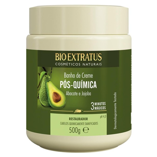 Bio Extratus - Banho De Creme Pós Química 500g O Banho De Creme Bio Extratus Pós Química Abacate foi desenvolvido com fórmula altamente nutritiva, recuperando seus cabelos dos danos das químicas, com ativo de abacate que é antioxidante ativando a circulação sanguínea e ajudando no crescimento do cabelo, além de contem Jojoba que controla a oleosidade do couro cabeludo, e proporciona hidratação sem deixar oleosidade. O Banho De Creme Bio Extratus Pós Química restaura e protege sua fibra capilar dos danos. Conselho de Aplicação Após os cabelos lavados com o shampoo, aplique uma pequena quantidade Do Creme de Tratamento e enluve os cabelos deixei agir de 10 a 15 Minutos e enxague.