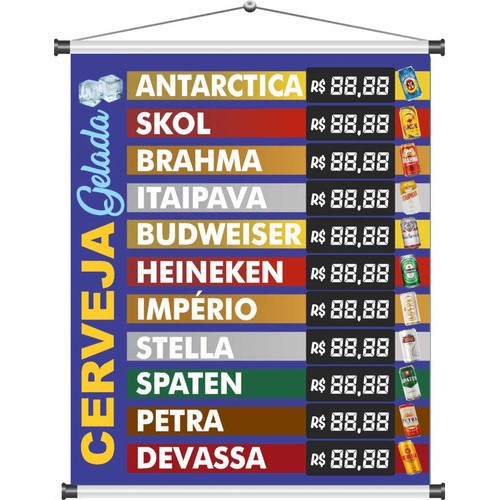 | Banner Adega Bebidas 60x50cm -cervejas divulgação tabela de preços este produto | R$ 38,88 | — | 5.0/5 | 2 |