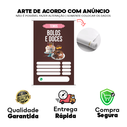 | Banner Confeitaria Bolo e Doces Encomendas Lona 440g Muito resisten... este produto | R$ 46,89 | — | 4.9/5 | 7 |