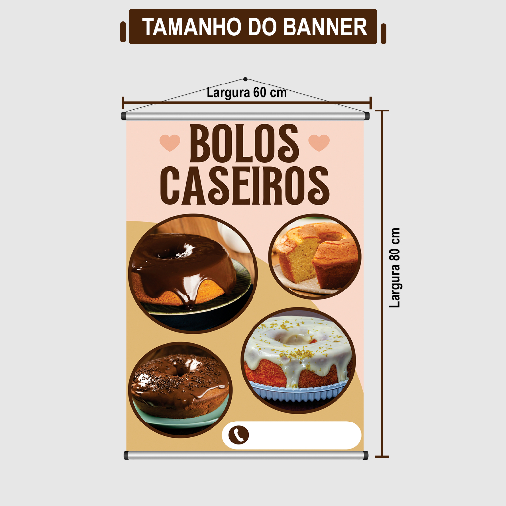 BANNER PRONTO - Bolos Caseiros e Festas - Acabamento em bastao de madeira na parte superior e inferior e cordao para pendurar - Tamanhos variados - Uso interno e externo - Material Impresso em alta qualidade . ATENÇÃO! MODELO PRONTA ENTREGA! NÃO FAZEMOS ALTERAÇÃO NA ARTE
