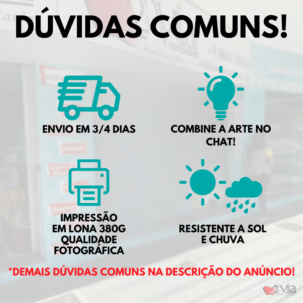 Banner Personalizado com Sua Arte – Feito em Lona Impermeável, Impressão Premium e Frete Rápido ✅Sobre o produto: ✔ Opções de impressão: Lona brilho ou fosca 380g Eco Solvente. Conforme disponibilidade ✔ Tamanhos: Fazemos em qualquer tamanho, caso não esteja cadastrado nos avise que cadastraremos para te atender ✔ Acabamento: Impressão em Lona 380g, com bastões pretos ou brancos combinando com a arte e corda para pendurar ✅Diferencial do nosso produto: ✔ Ótima qualidade ✔ Alta durabilidade ✔ Banners em lona são mais duráveis ao tempo ✔ Podem dobrar, molhar, pegar sol e chuva sem problemas ✔ Envio super rápido: Enviamos 3 a 4 dias após o envio da arte ✔ Características: Imprimimos a arte que o cliente desejar e no tamanho que desejar ✅Avisos e Cuidados: ✔ Temos um mínimo de R$30,00 por pedido de banner ✔ Variações: a cor pode variar até 10% devido ao tipo de tela e de impressão ✔ A durabilidade depende do manuseio. O fabricante garante 3 anos exposto ao tempo ✔ Arte: envie sua arte no nosso chat. Caso não tenha arte, cobramos 50 reais pelo trabalho de criação. Solicite o link do produto criação de arte e inclua na compra ✔ Não imprimimos, prateado ou dourado pois o processo de produção é diferente! Dourado vai sair amarelo ouro e prateado acinzentado ✔ A qualidade depende diretamente do arquivo que nos enviar. Evite letras pequenas pois não ficam boas nesse tipo de impressão! Iremos te avisar caso não vá ficar bom 🚚 Envio Super Rápido 🥰 Para dúvidas, estamos à disposição no chat