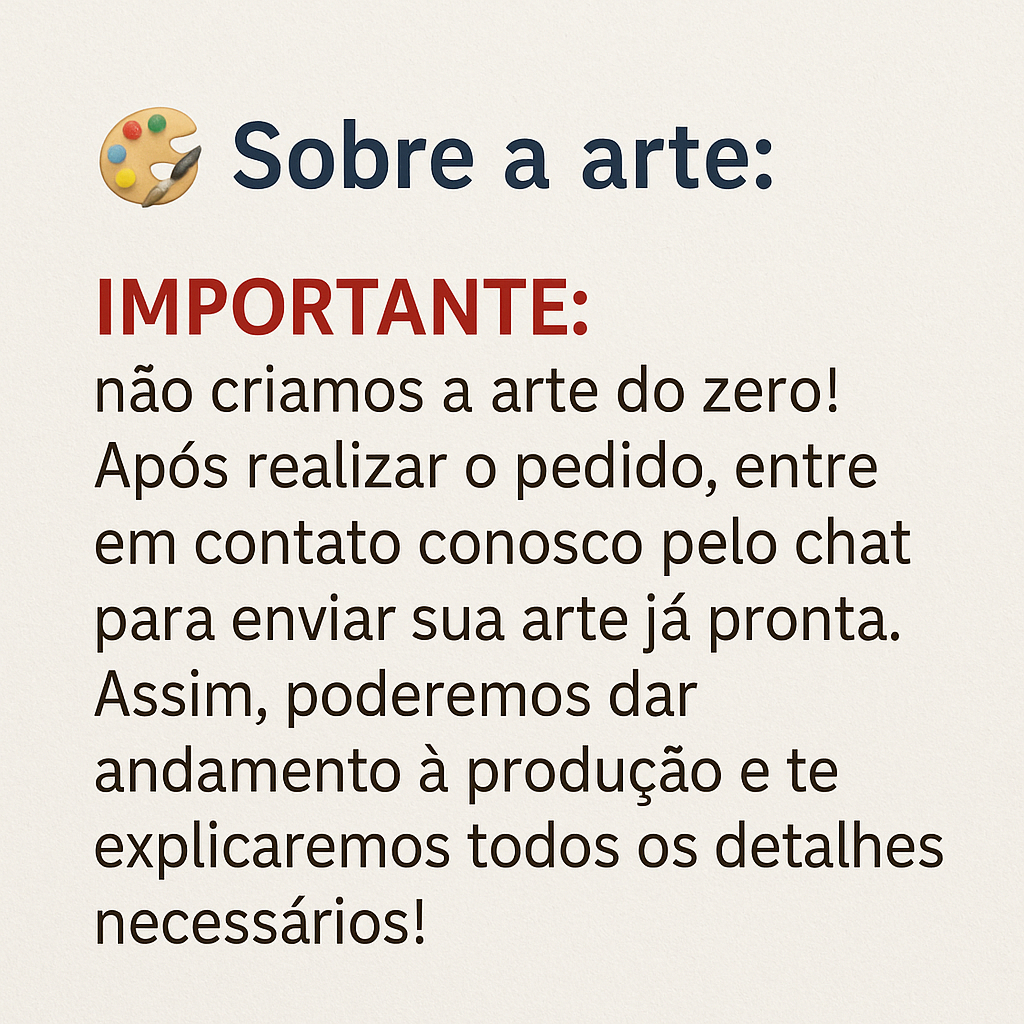 Banner Personalizado Lona Sua Logo Arte Prova D´Água 120x80cm ATENÇÃO PARA POSSÍVEIS DÚVIDAS. IMPORTANTE: não criamos a arte do zero! Após realizar o pedido, entre em contato conosco pelo chat para enviar sua arte já pronta. Assim, poderemos dar andamento à produção e te explicaremos todos os detalhes necessários! Em caso de dúvidas, entre em contato conosco pelo chat. Estamos à disposição para te atender o mais rápido possível, da melhor forma! ESPECIFICAÇÕES E CARACTERÍSTICAS DO PRODUTO: Impressão digital em lona de alta qualidade, com cores fortes e vibrantes. Tamanho: 80x120cm Acabamento: • Banner com madeira, ponteira e corda para pendurar. Alta durabilidade. Pode ser utilizado em ambientes internos e externos. Resistente à chuva e à luz solar – pode molhar e até ser lavado sem danificar! Atenção: não utilize solventes na limpeza. Acompanha 1 (um) banner. As cores não desbotam mesmo sob exposição contínua à luz ou ao sol. Imagens Meramente Ilustrativas.