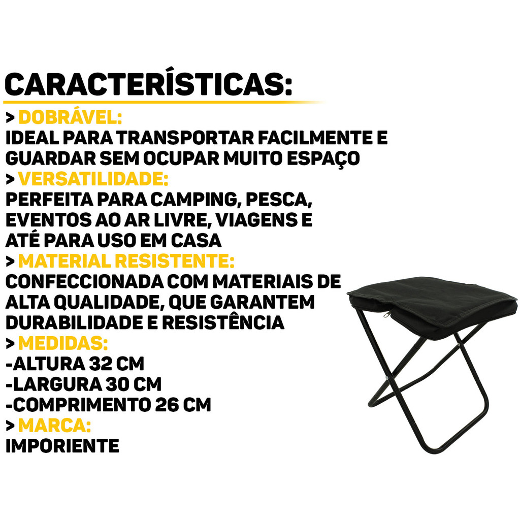 Banco Dobrável Imporiente O Banco Dobrável Imporiente é a escolha ideal para quem busca conforto em suas aventuras ao ar livre. Compacto e funcional, esse banco oferece um assento confortável, ideal para quem gosta de acampar, fazer trilhas ou aproveitar momentos de lazer em parques e praias. Características: > Assento em tecido oxford resistente; > Ideal para camping, piqueniques, pesca, praias, entre outras atividades; > Seu design dobrável facilita o armazenamento e transporte, ocupando pouco espaço. Especificações Técnicas: > Capacidade para até 150kg; > Material: ferro e tecido oxford; > Dimensões do produto: 30cm x 26cm x 32cm. - Marca: Imporiente - Garantia: 90 dias contra defeitos de fabricação Vantagens de comprar na Brester: - Produto a pronta entrega. - Produto novo, com garantia de fábrica. - Nota fiscal para Pessoa Física e Pessoa Jurídica.