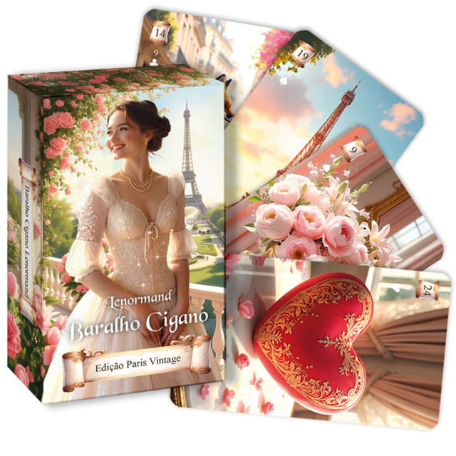 Baralho Cigano Tarot Lenormand Ed. Paris Vintage Idioma Português, 40 cartas + livreto + caixa Permita-se conectar com a magia do povo Cigano. 100% em Português. Produto à pronta entrega, envio imediato. Alta durabilidade, material laminado/plastificado acabamento brilho glossy. Cartas no tamanho 7x12 cm, cantos aredondados, papel triplex 350g. Este kit contém: 1. 36 cartas ilustradas do Baralho Cigano Lenormand, mais 4 cartas extras adicionais. 2. Um livro de 100 páginas com instruções sobre como utilizar este baralho e os significados de cada carta. 3. Caixa resistente em papel triplex. Cartas: Tamanho 7x12 cm, cantos aredondados, papel triplex 350g. Alta durabilidade, material laminado/plastificado acabamento brilho glossy. Caixa: Tamanho 8x13 cm em duas partes (tampa e fundo), papel triplex 350g. Alta durabilidade, material laminado/plastificado acabamento brilho glossy. Livreto: Tamanho 7x12 cm, 100 páginas internas.