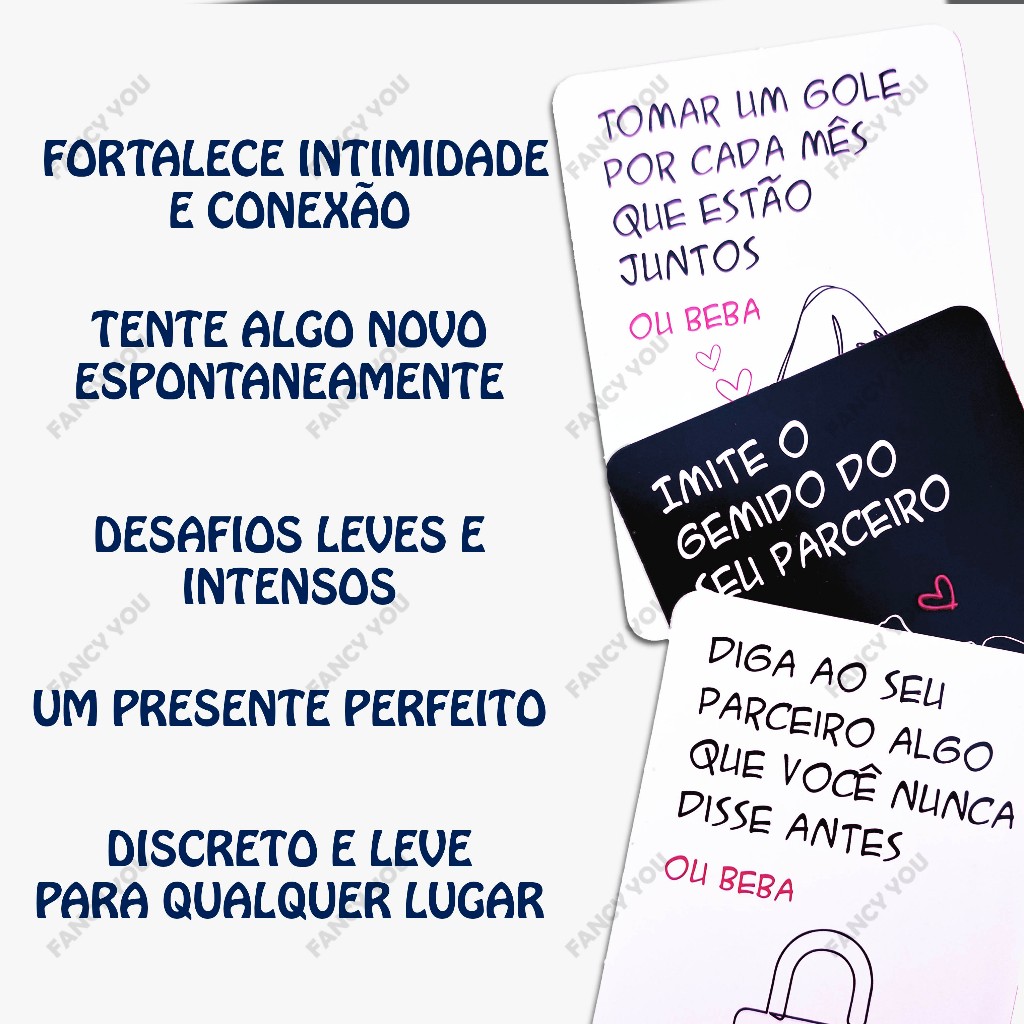 🔥 Baralho Desejos e Drinks - Jogo de Cartas para Casais – Noite de Prazer e Diversão! 🔥 Transforme suas noites em uma experiência inesquecível com este jogo de cartas perfeito para casais que desejam apimentar a relação de forma divertida, envolvente e cheia de surpresas! Com 50 cartas ousadas, cada rodada traz um novo desafio que promete aumentar a conexão e despertar desejos. 💋 Como jogar? 🍷 Prepare a bebida de sua preferência. 🎴 Embaralhe as cartas e reveze com seu parceiro(a) na compra das cartas. 🔥 Cada carta contém um desafio sensual – cumpra a tarefa ou tome um shot! 💑 As cartas foram elaboradas para que ambos possam participar e criar momentos de cumplicidade e prazer. 💎 Por que você vai amar? ✔ Ideal para sair da rotina e fortalecer a intimidade. ✔ Desafios leves e intensos para todos os níveis de ousadia. ✔ Perfeito para noites românticas, datas especiais e momentos inesquecíveis. ✔ Discreto e compacto, fácil de levar para qualquer lugar. 📦 O que está incluso? ✅ 28 Cartas Pretas com desafios mais quentes. ✅ 22 Cartas Brancas com desafios mais leves. 📌 Envio 100% discreto 🔥 Está pronto(a) para elevar a temperatura com seu amor? Compre agora e descubra novas formas de prazer e conexão!