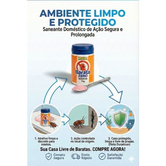 ✅ "Produto de venda livre com nota fiscal, devidamente regularizado para uso domiciliar, conforme normas da ANVISA." 🏠 Mantenha sua casa protegida com o Barata Zero, uma solução moderna desenvolvida especificamente para o ambiente doméstico. ✨ Diferente de sprays comuns que espalham cheiro forte, nossa fórmula atua de maneira silenciosa e eficaz. 🤔 Por que escolher este produto? 💧 Aplicação Limpa: O formato isca permite aplicar apenas pequenas quantidades nos cantos, sem sujeira. 🍃 Discreto e Sem Cheiro: Ideal para apartamentos, cozinhas e despensas. Não deixa odores desagradáveis no ambiente. 🛡️ Segurança em 1º Lugar: Desenvolvido para uso domiciliar (Venda Livre). Seguro para o ambiente quando aplicado nos locais recomendados (frestas, atrás de móveis). 🔄 Ação em Cadeia: O produto atrai o inseto, que leva a solução para o ninho, resolvendo o problema na raiz sem a necessidade de aplicações excessivas. 🛠️ Modo de Uso Simplificado: Aplique pequenas quantidades próximo aos locais onde os insetos transitam (dobradiças, embaixo de pias, atrás de geladeiras). O produto fará o resto. 📋 Ficha Técnica: 🔹 Tipo: Isca Atrativa / Saneante Doméstico 🎯 Indicação: Barata (Francesinha / Paulistinha / Germânicas / Safira) 📝 Registro ANVISA: 3.3419 0001 🌿 Composição: Formulado com atrativos naturais de uso domissanitário. 🏭 Produto original da Indústria Química Integral. Emitimos Nota Fiscal 📄. ✅ "Produto de venda livre com nota fiscal, devidamente regularizado para uso domiciliar, conforme normas da ANVISA."