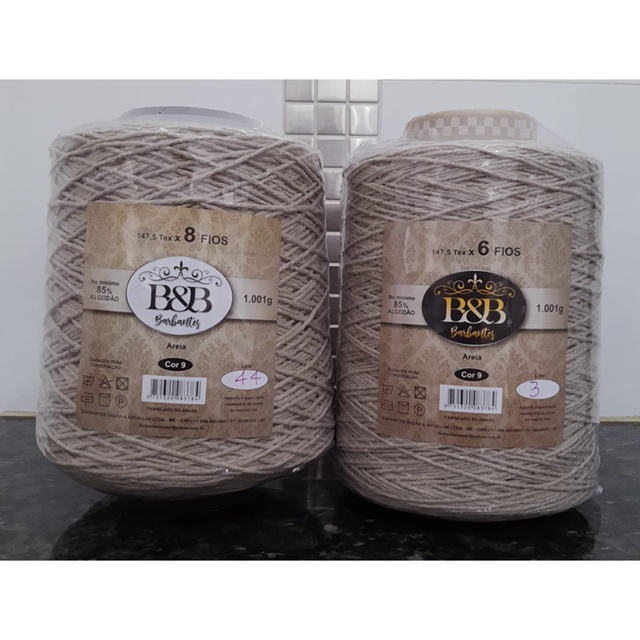 OBS; A FOTO É APENAS PARA MOSTRAR A VARIAÇÃO DO FIO 6 E DO FIO 8. O VALOR É REFERENTE A UM ÚNICO CONE DE 1 KG. Barbante com no mínimo 85%Algodão tex por fio 147,5 Por ser um produto de fabricação artesanal pode apresentar variação na cor dependendo do lote. 6 Fios Tex Total 885 8 Fios Tex Total 1180 Peso 1kg