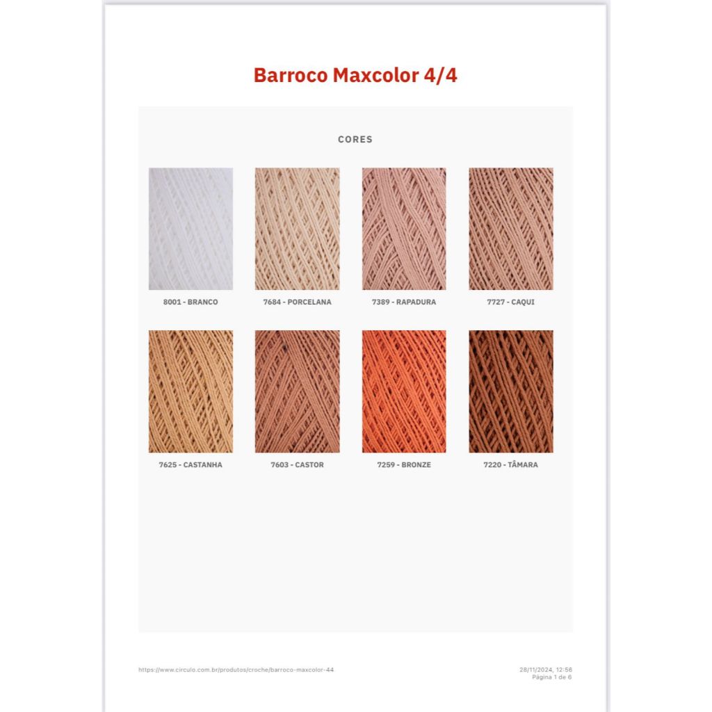 A família do Barroco cresceu e agora acrescentou o Barroco Maxcolor 4, mais uma opção de espessura, uma versão mais leve, ideal peças de decoração, amigurumis e também para peças de vestuário. O fio tem alto rendimento (são 338 metros) e é composto por 100% puro algodão com a qualidade que já é consagrada no mercado. DADOS TÉCNICOS Fio: Ne 4/4 590 tex Composição: 100% Algodão Peso e comprimento: 200 g e 338 m Agulhas para crochê: 2,5 mm a 3,5 mm Agulhas para tricô: 4 mm a 6 mm Quantidade de cores: 54 Cartela de cores