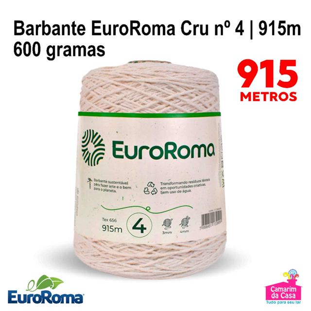 O talento e a criatividade do artesanato se transformam em produtos exclusivos com o barbante EuroRoma. Produzidos de forma sustentável, os barbantes apresentam qualidade, maciez, beleza e versatilidade. Ideal para crochê, tricô, macramê, tear, tapeçaria e artesanato em geral. Informações Técnicas: Cor: Cru Cone com: 600 gramas Medida: Nº 4 - 915 metros (usar agulhas Crochê: 3mm e Tricô: 4mm) Nº 6 - 610 metros (usar agulhas Crochê: 3,50mm e Tricô: 4,5mm) Nº 8 - 457 metros (usar agulhas Crochê: 4mm e Tricô: 5mm) Nº 10 - 366 metros (usar agulhas Crochê: 4,50mm e Tricô: 6mm) Composição: 85% Algodão / 15% Outras fibras Marca: EuroRoma Observação: as cores disponíveis podem variar de acordo com o modelo do celular ou tela do computador.