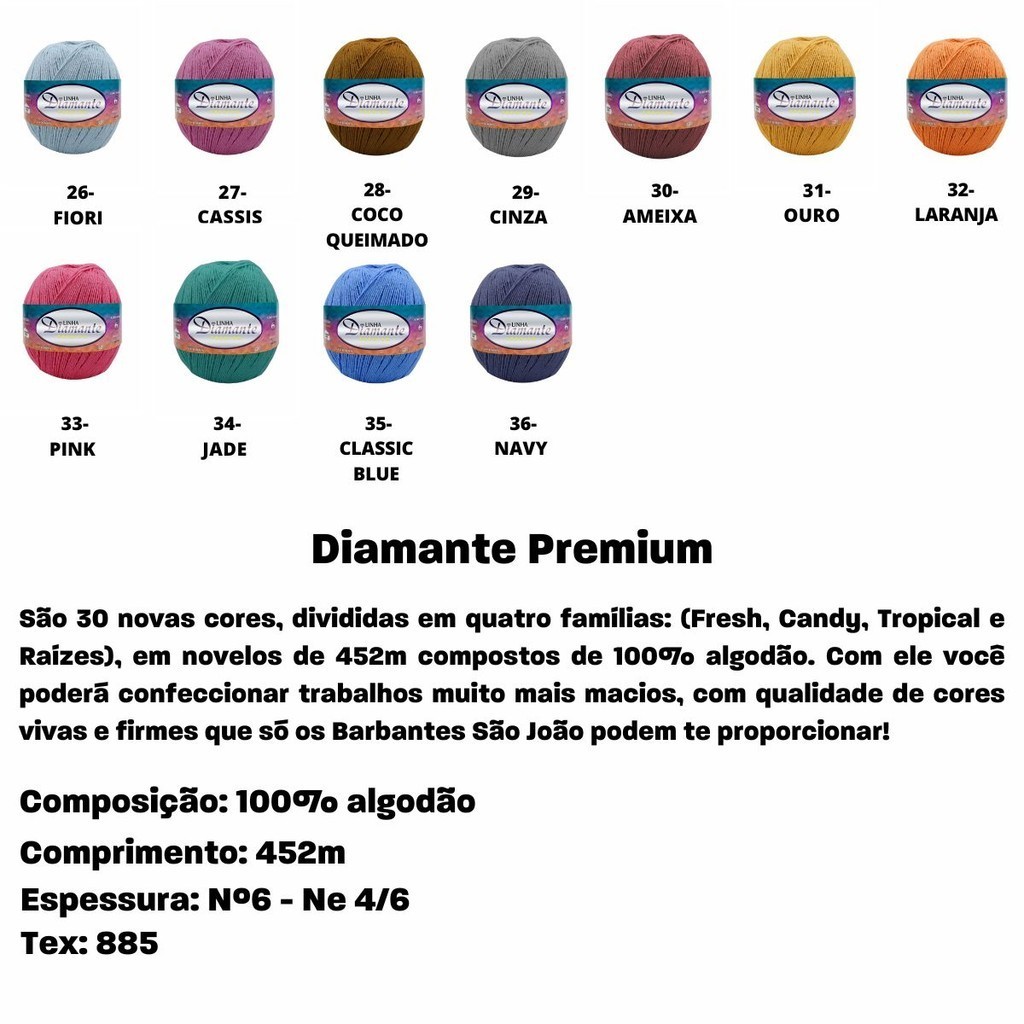 DIAMANTE PREMIUM A linha Diamante Premium está de cara nova!São 30 novas cores, divididas em quatro famílias, Fresh, Candy, Tropical e Raízes em novelos de 452m compostos de 100% algodão. Com ele você poderá confeccionar trabalhos muito mais macios, com qualidade de cores vivas e firmes que só os Barbantes São João podem te proporcionar! Composição: 100% algodão Comprimento e Peso: 452 metros / 400 gramas Espessura: Fio 6 - Ne 4/6Tex: 885 ⚠️ AS IMAGENS SÃO MERAMENTE ILUSTRATIVAS DE ACORDO COM AS FOTOS DISPONIBILIZADAS PELOS FORNECEDORES E PODEM VARIAR DE ACORDO COM O LOTE DE FABRICAÇÃO ⚠️