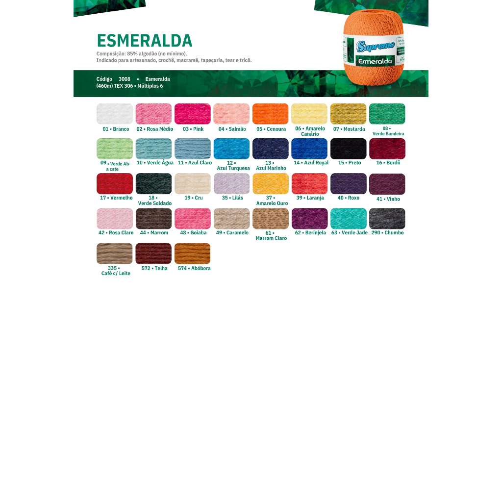 Barbante Supremo Esmeralda.Indicado para artesanato, crochê, macramê, tapeçaria, tear e tricô. Novelo com 460m 85% Algodao no minimo. Tex: 306 Novidade na familia Supremo agora em bola. Para crochê, tricô e artesanato. Agulha: - Croche: 1,75mm a 2,0 mm Fabricante: Supremo